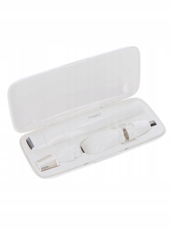 Универсальное бритвенное устройство для женщин включает в себя полный комплект с четырьмя различными триммерными головками и футляром для хранения устройства и аксессуаров.