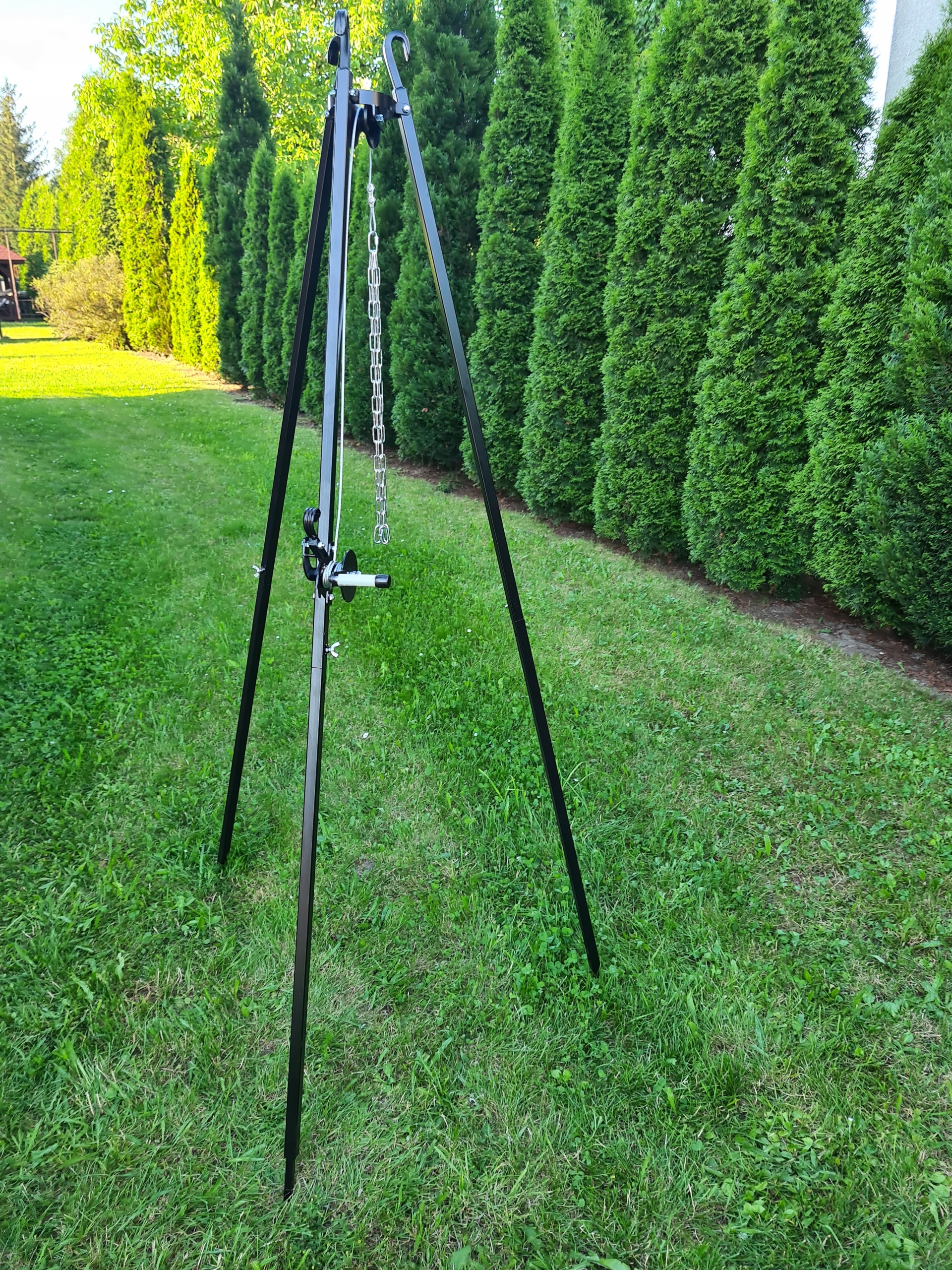 Высота штатива около 191 см, ножки складываются в две части, что значительно облегчает транспортировку. А раскладывание и складывание штатива занимает всего минуту и очень просто благодаря используемым барашковым винтам. Благодаря специальной катушке регулировать решетку очень просто и удобно, и поэтому мы имеем полный контроль над процессом приготовления на гриле. Кроме того, штатив имеет изящные украшения, благодаря чему он отлично смотрится, например, в сад.