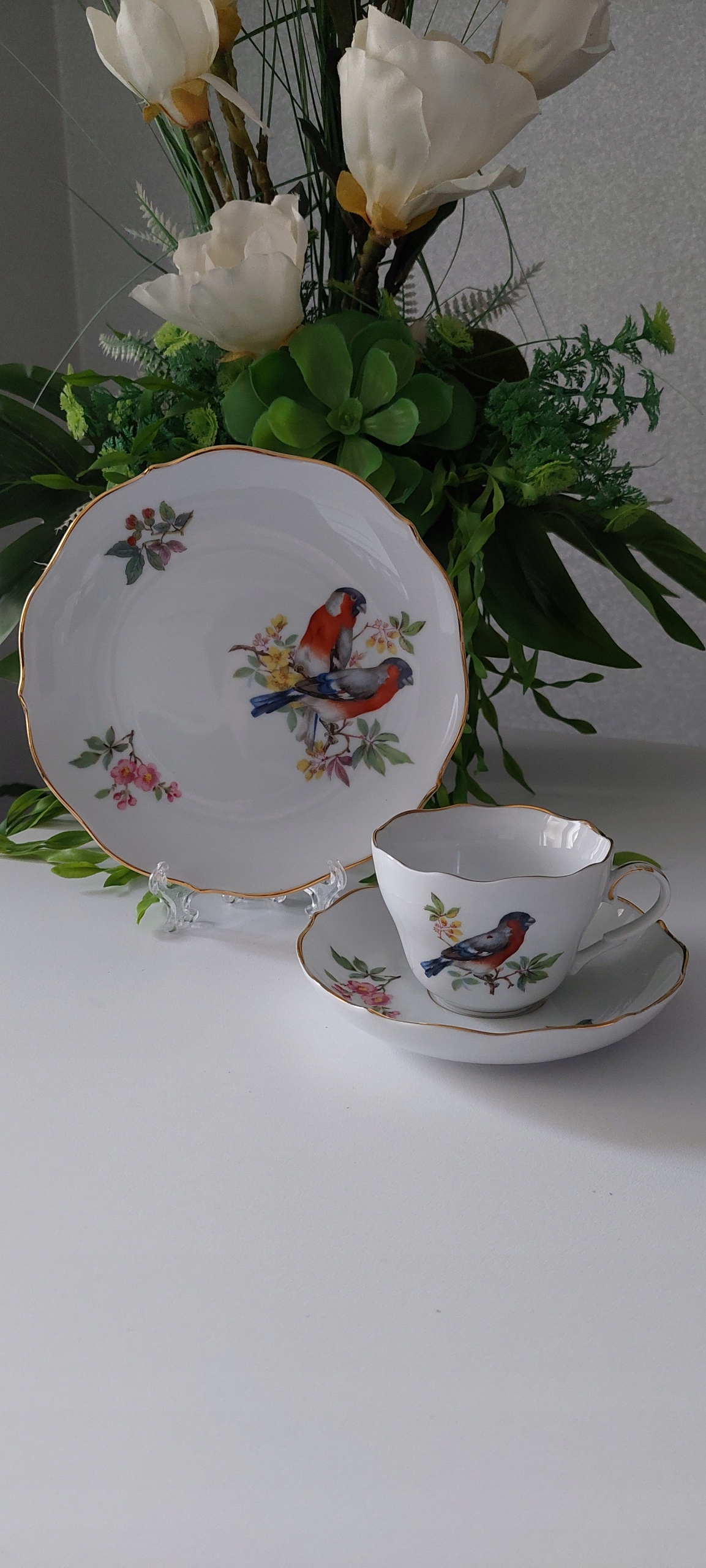 Трио в очень хорошем состоянии с размерами, высота чашки 6см, диаметр инфузии 8,5 см, диаметр пластины для чашки 14 см, диаметр десерта 19 см.