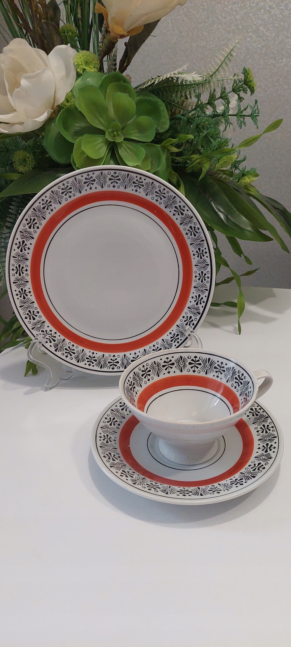 Трио с размерами: высота чашки 6см, диаметр чаши 10см, диаметр тарелки 14см, диаметр десертной тарелки 19см. Небольшие царапины на тарелках, см. фото.
