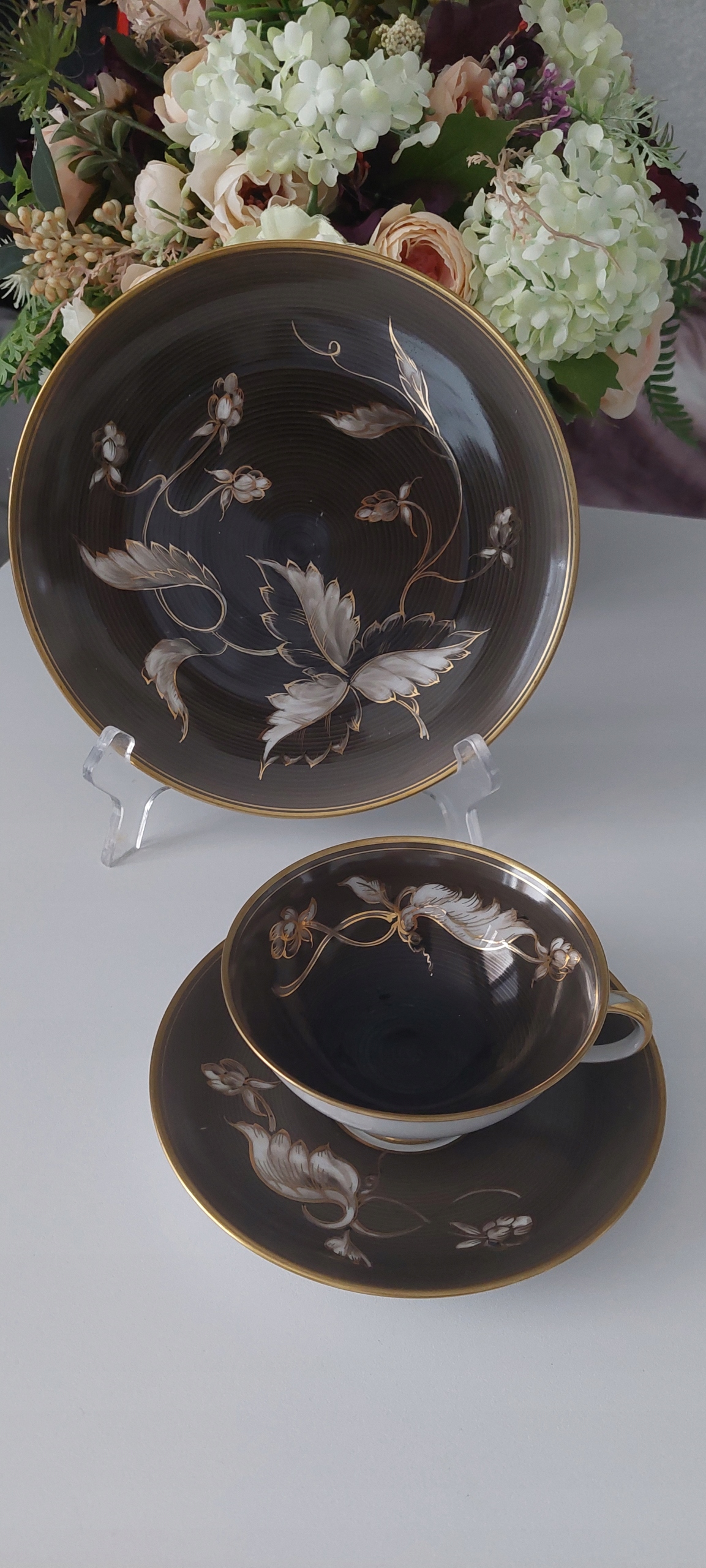 Трио с размерами, высота чашки 5,5 см, диаметр чаши 10,5 см, диаметр пластины под чашкой 15 см, диаметр десертной пластины 19,5 см. Пластины имеют царапины эмали, видимые на картинках.