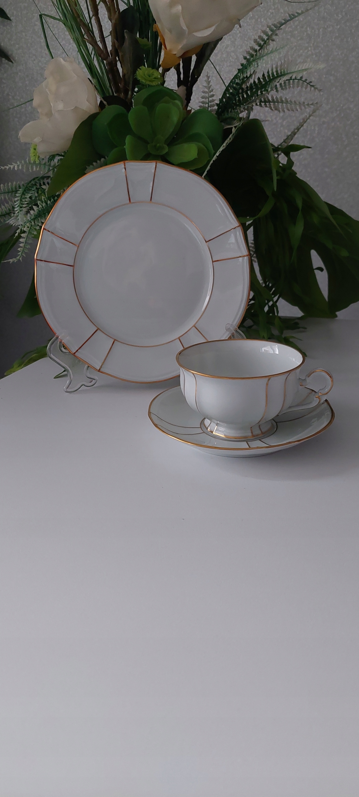 Трио Фюрстенберг в очень хорошем состоянии с высотой чашки размеров 6 см, диаметром чаши 9 см, диаметром пластины для чашки 14 см, диаметром десертной пластины 19 см.