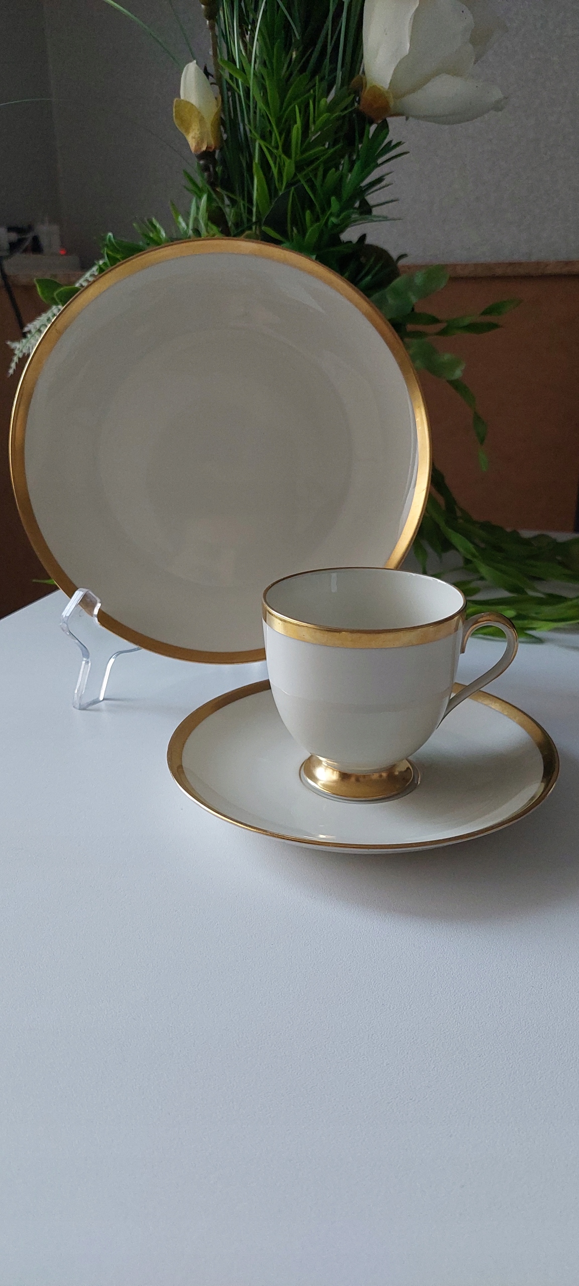 Furstenberg Trio цвета экрю, размеры: высота чашки 7 см, диаметр чаши 7,5 см, диаметр тарелки для чашки 15 см, диаметр десертной тарелки 19,5 см. Минимальные недостатки позолоты.