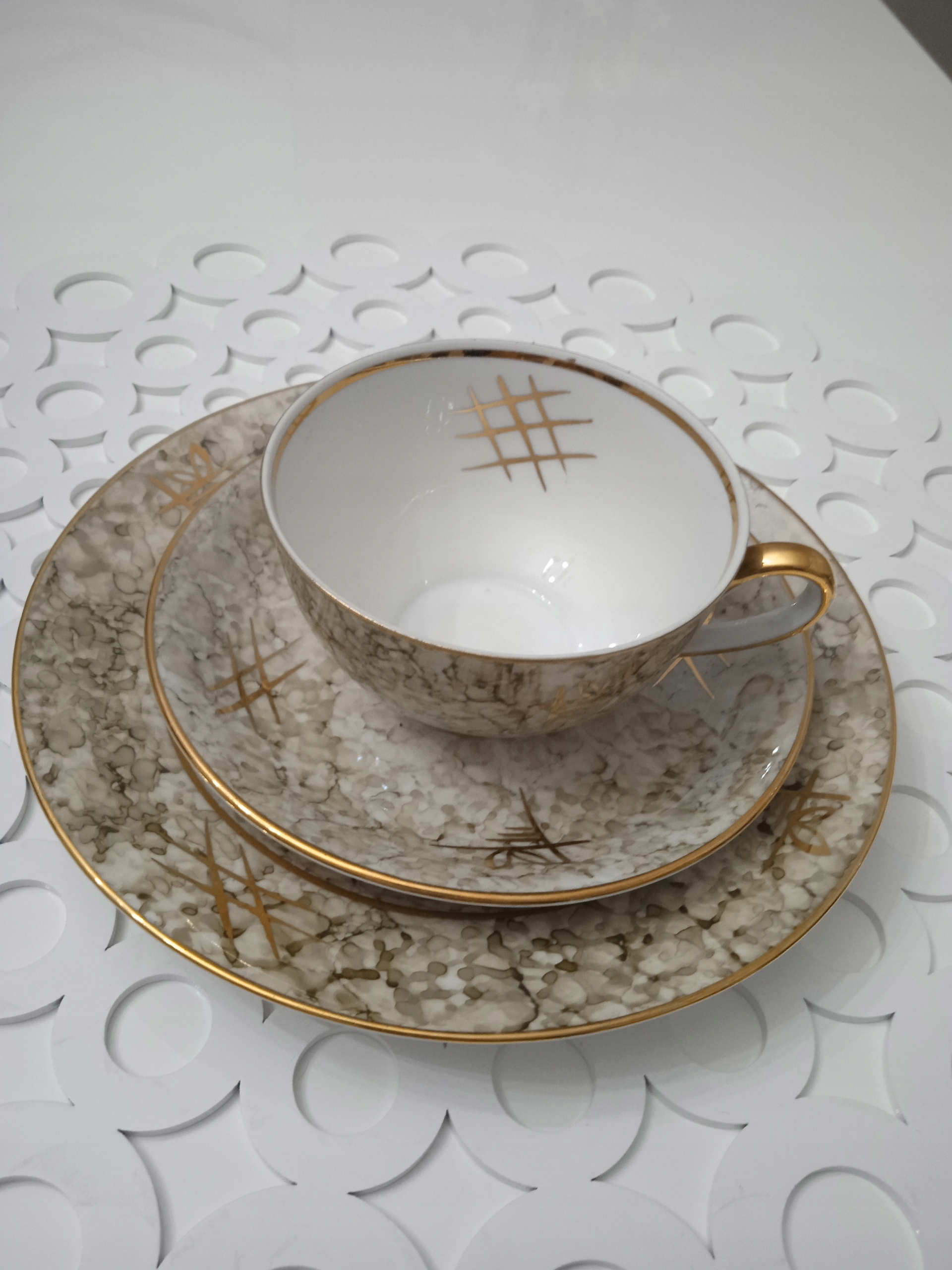 Трио с размерами: высота чашки: 5 см, диаметр тарелки для чашки: 14 см, диаметр десертной тарелки: 18,7 см.