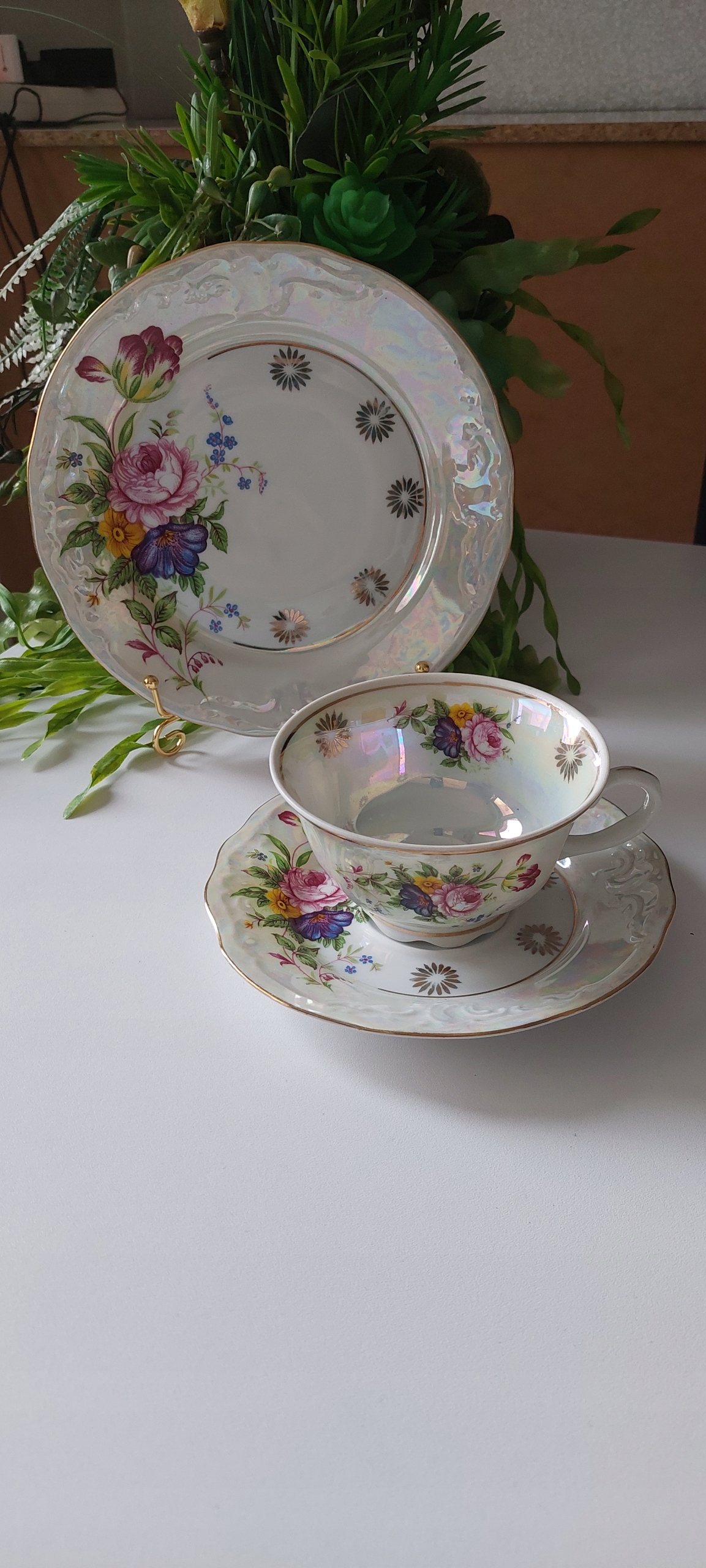 Трио в белом цвете, размеры: высота чашки 6 см, диаметр чаши 10 см, диаметр тарелки для чашки 14 см, диаметр десертной тарелки 19 см. Состояние видно на фотографиях.