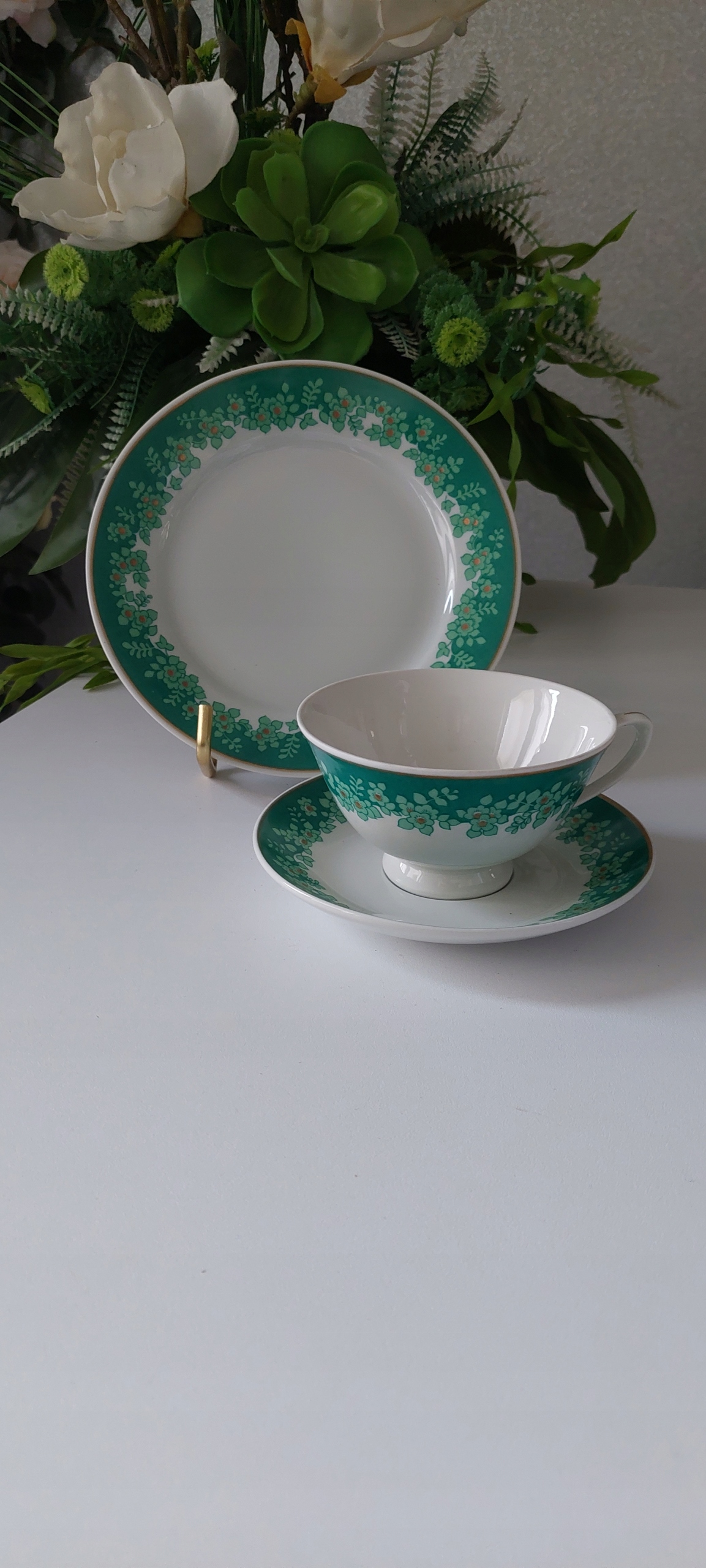 Трио с размерами: высота чашки 6см, диаметр чаши 10см, диаметр тарелки для чашки 14см, диаметр десертной тарелки 19см.