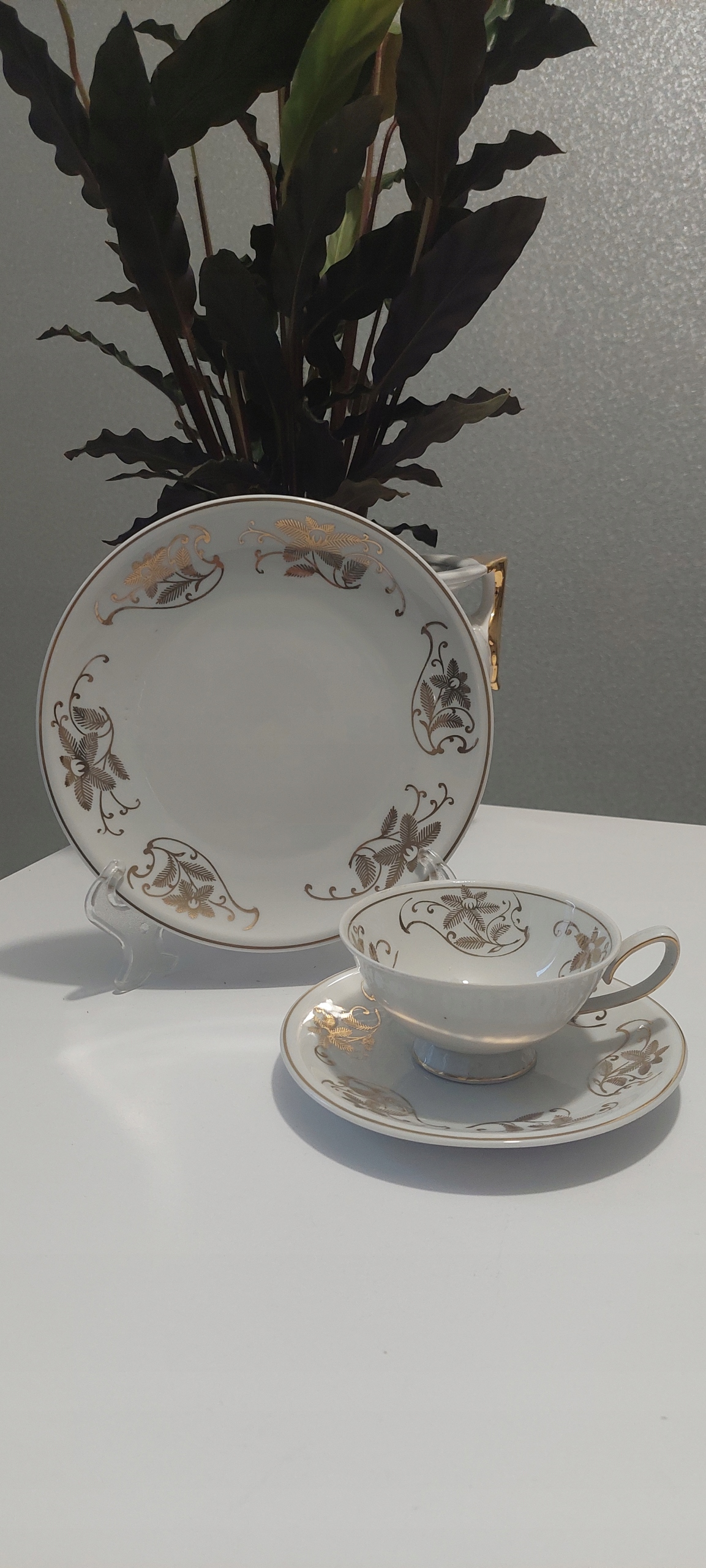 Трио с размерами чашки высоты 5,5 см, диаметр инфузии 10 см, диаметр пластины для чашки 15 см, диаметр десертной пластины 20 см.