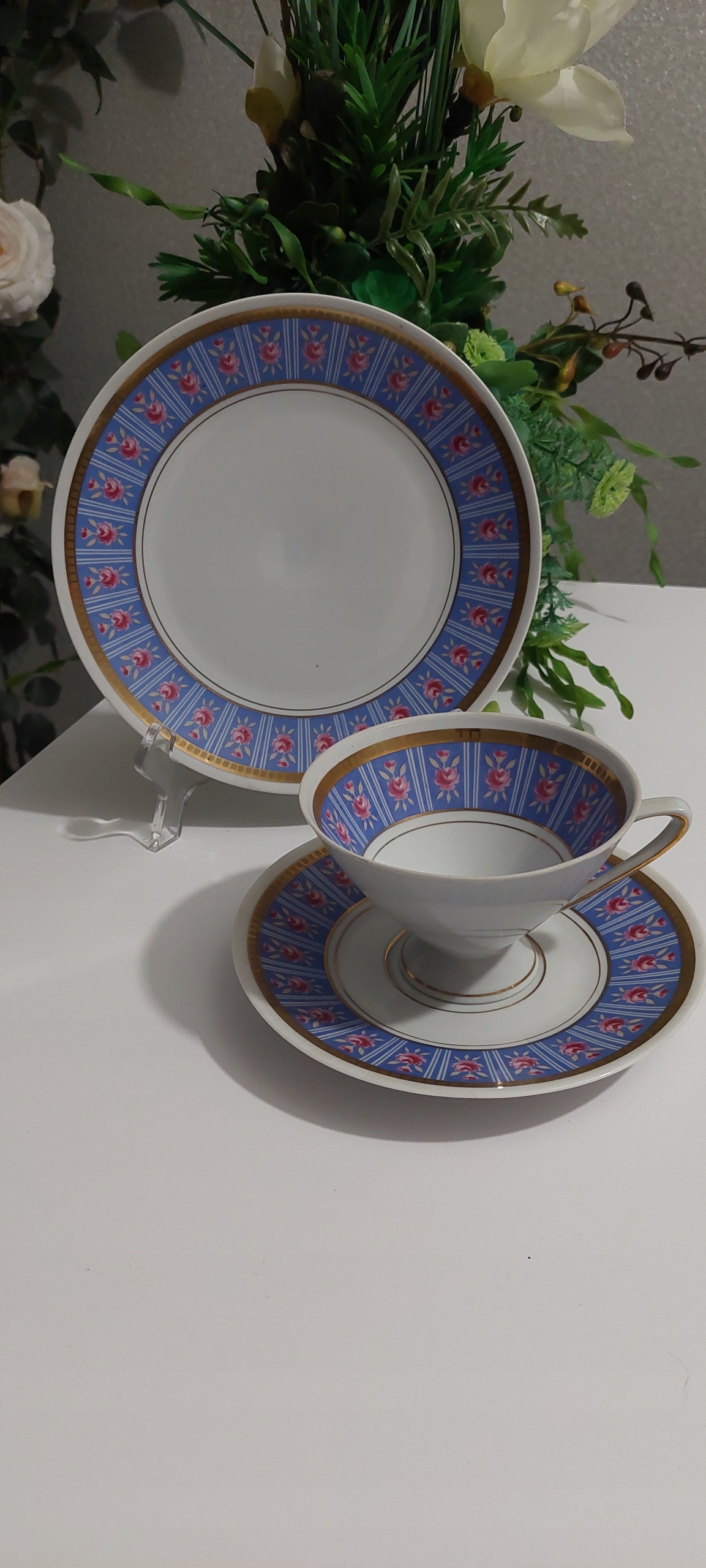 Трио с размерами чашки высоты 7 см, диаметр инфузии 11 см, диаметр пластины для чашки 16 см, диаметр десертной пластины 20 см.