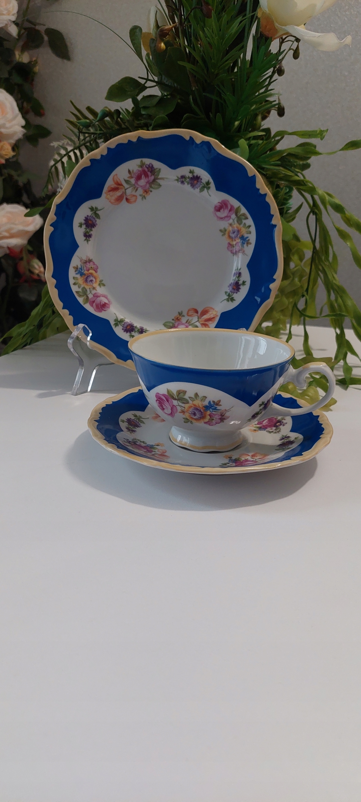Трио в очень хорошем состоянии, размеры: высота чашки 6см, диаметр чаши 10см, диаметр тарелки 14см, диаметр десертной тарелки 19см.