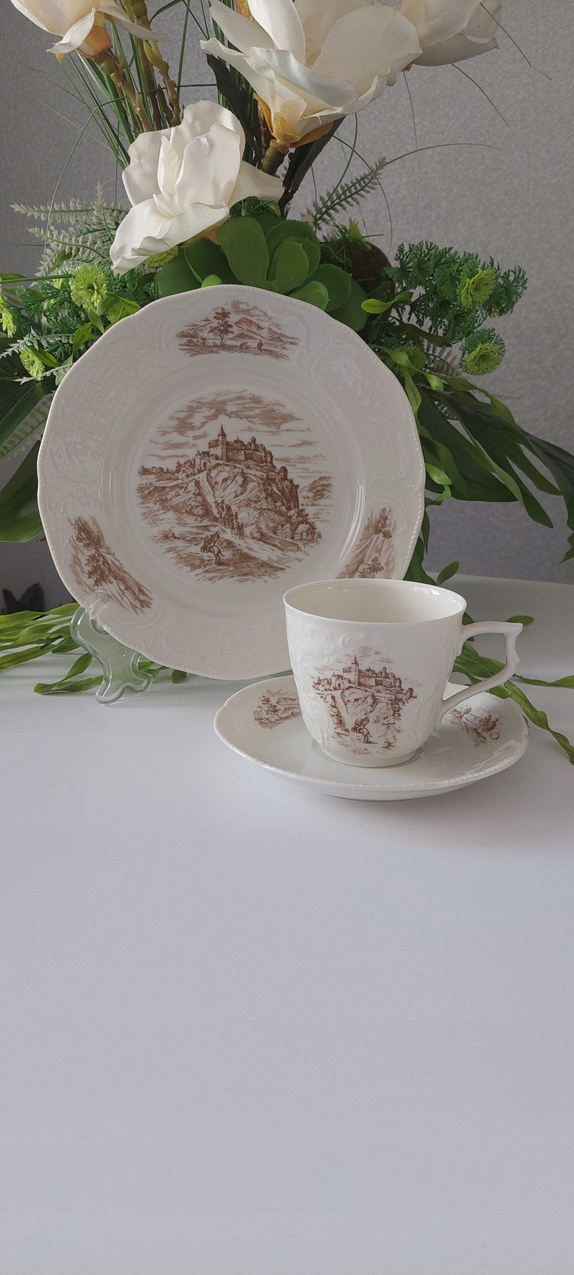 Трио РОЗЕНТАЛЬ, экрю, в очень хорошем состоянии, размеры: высота чашки 7 см, диаметр 8 см, диаметр подстаканника 14 см, диаметр десертной тарелки 20 см.