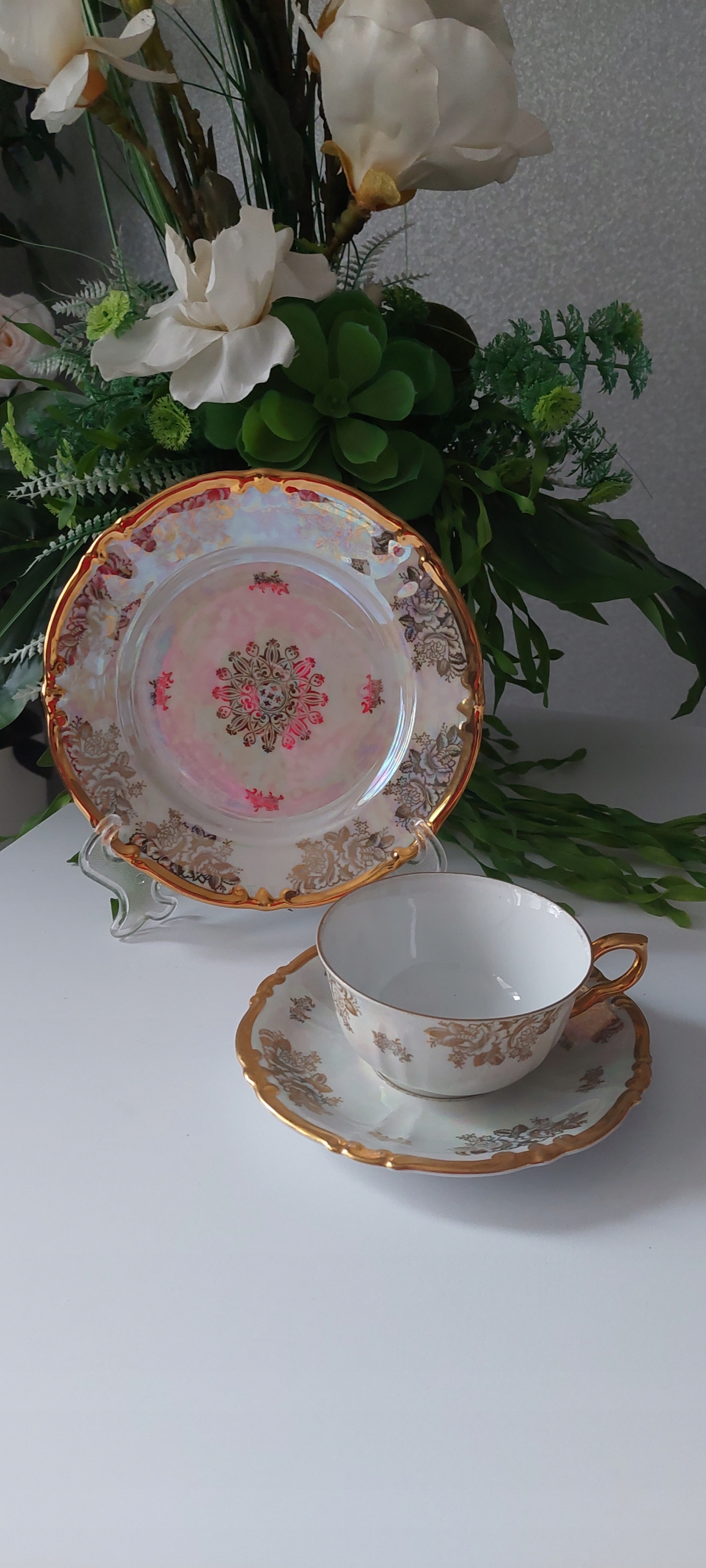 Трио с размерами: высота чашки 5см, диаметр наполнителя 10см, диаметр тарелки для чашки 15см, диаметр десертной тарелки 19см.