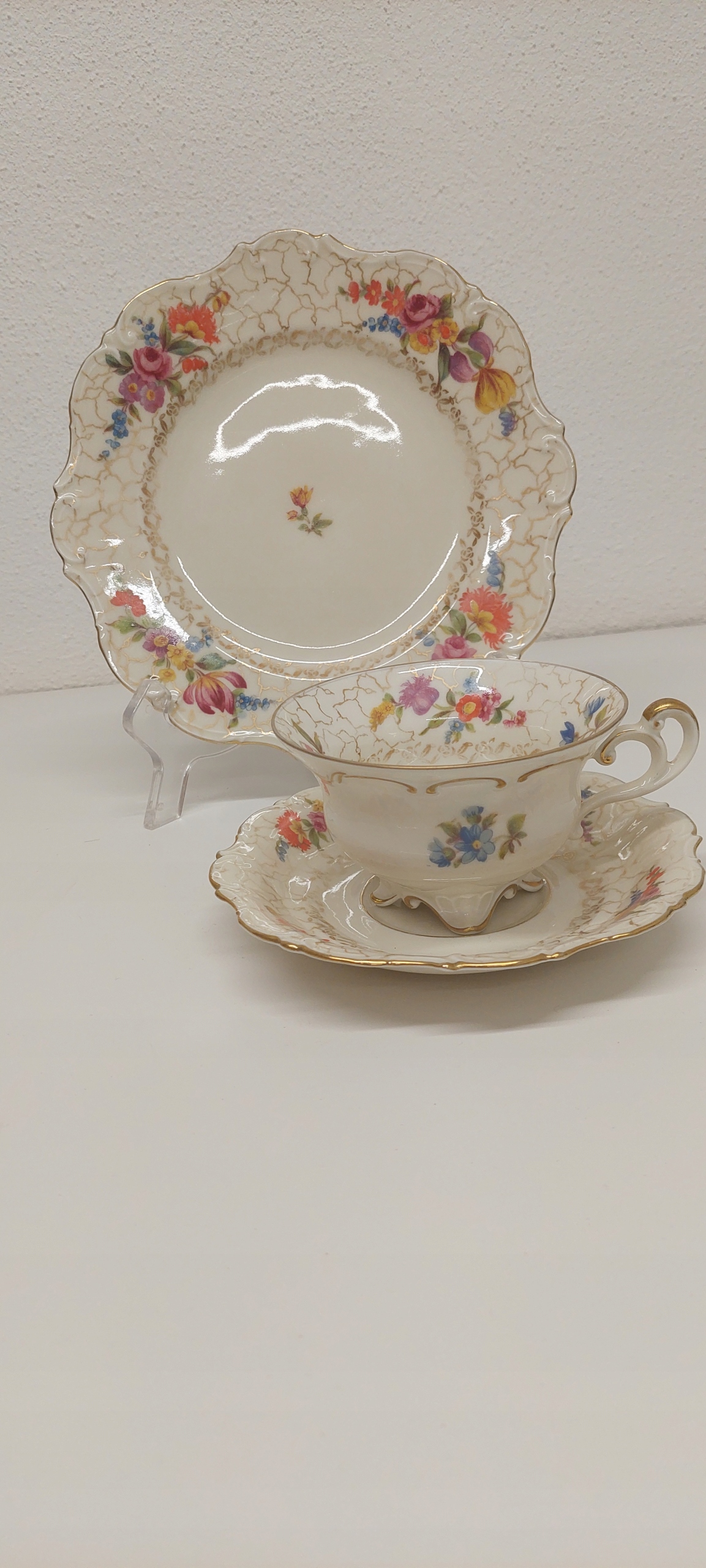 Трио Tillowitz в цвете экру с высотой размеров чашки 6 см, диаметром чаши 10 см, диаметром пластины под чашкой 14,5 см, диаметром десертной пластины 19,5 см. Минимальные ссадины, видимые на картинках