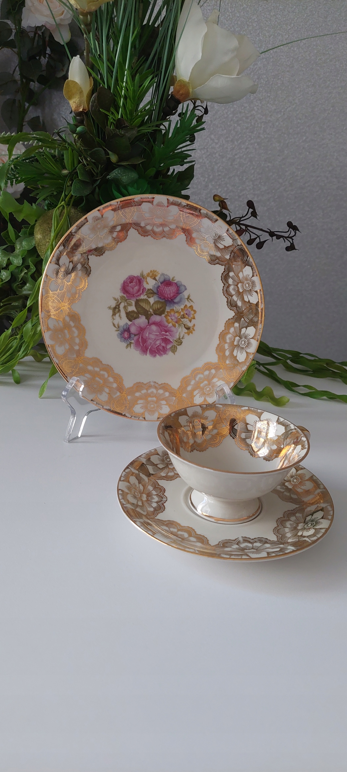 Экрю трио, размеры: высота чашки 5,5 см, диаметр чаши 10 см, диаметр тарелки для чашки 15 см, диаметр десертной тарелки 20 см.
