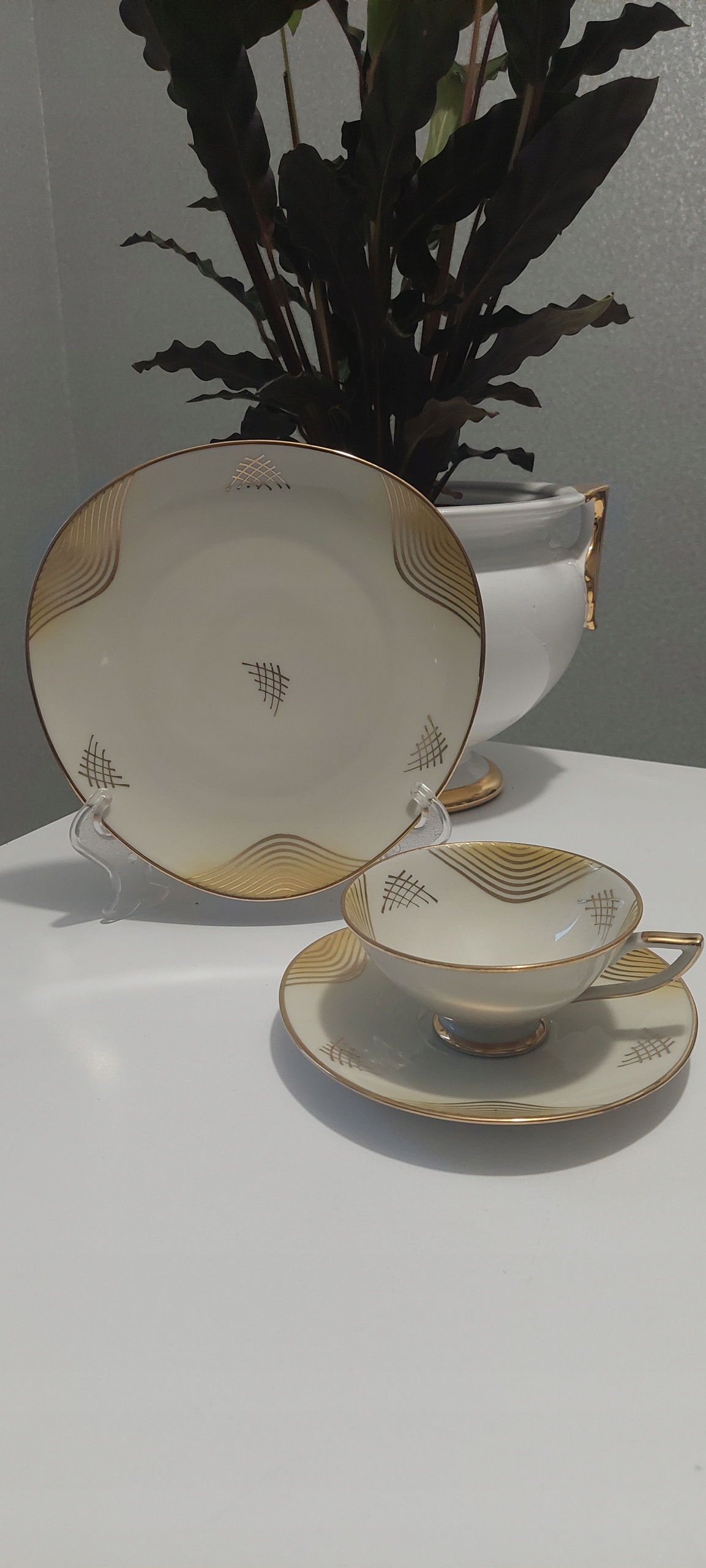 Трио с размерами чашки высоты 5,5 см, диаметр инфузии 10 см, диаметр пластины для чашки 15 см, диаметр десертной пластины 20 см.