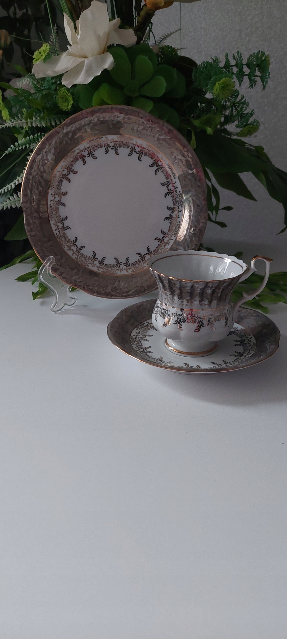 Трио с размерами: высота чашки 8см, диаметр наполнителя 8см, диаметр тарелки для чашки 15см, диаметр десертной тарелки 19см.