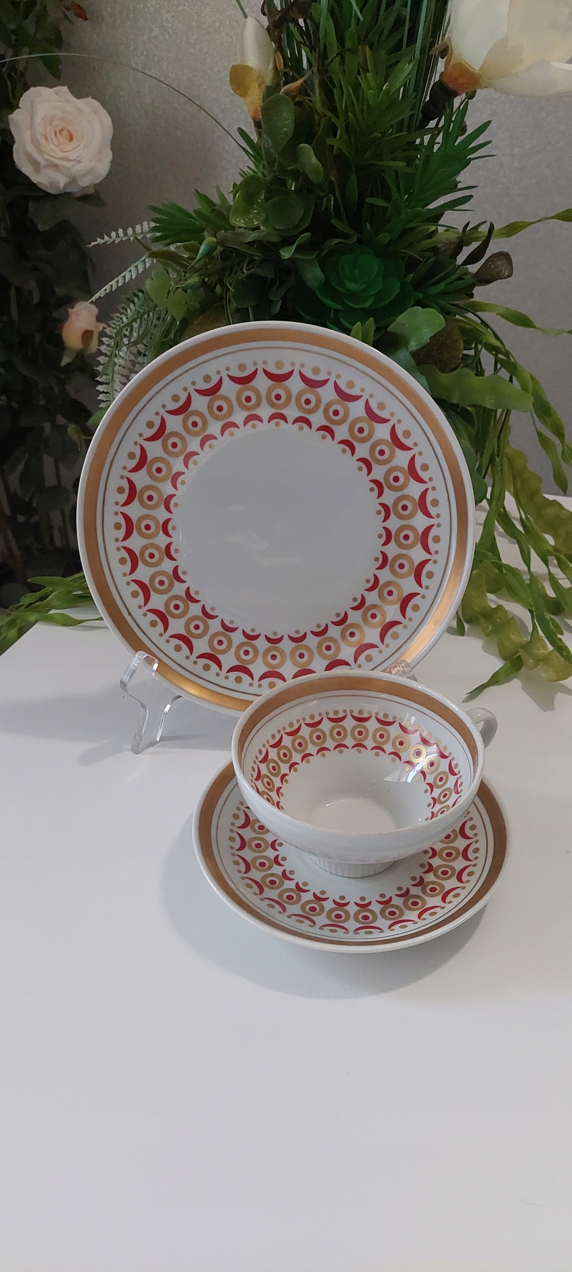 Трио с размерами: высота чашки 5,5 см, диаметр чаши 10 см, диаметр тарелки для чашки 14 см, диаметр десертной тарелки 19 см.