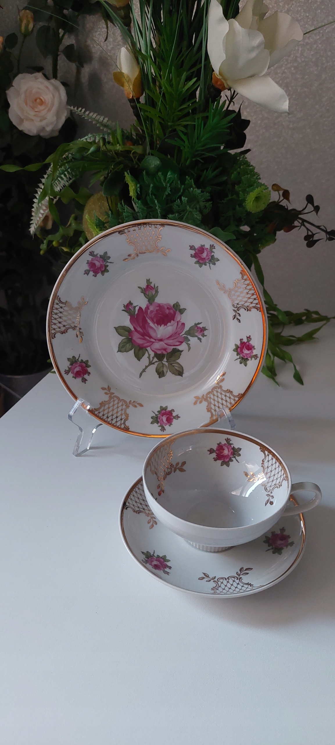 Трио с размерами: высота чашки 5см, диаметр чаши 10см, диаметр тарелки для чашки 15см, диаметр десертной тарелки 19см.