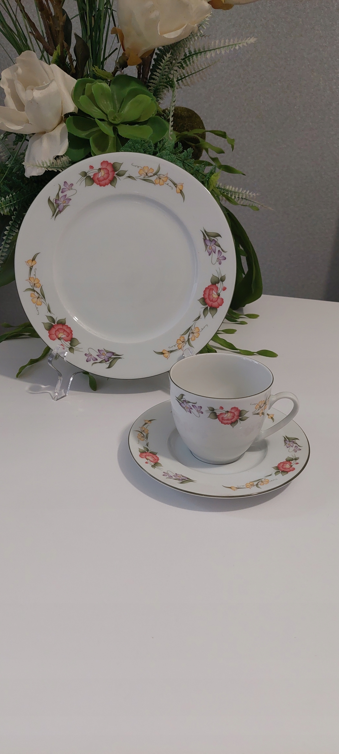 Трио с размерами: высота чашки 7см, диаметр наполнителя 8см, диаметр тарелки для чашки 15см, диаметр десертной тарелки 21см.