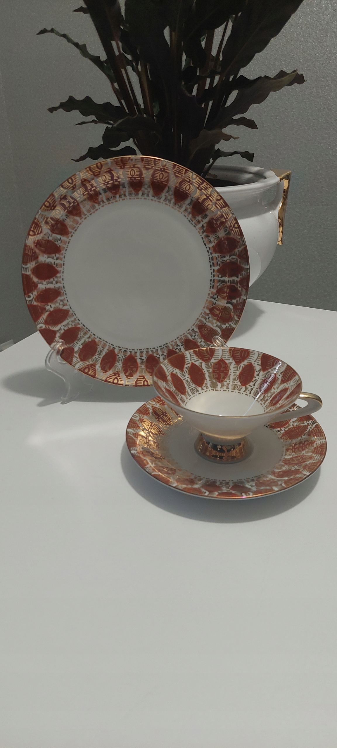 Трио с размерами: высота чашки 5,5 см, диаметр наполнителя 10 см, диаметр тарелки для чашки 15 см, диаметр десертной тарелки 20 см. Без подписи.