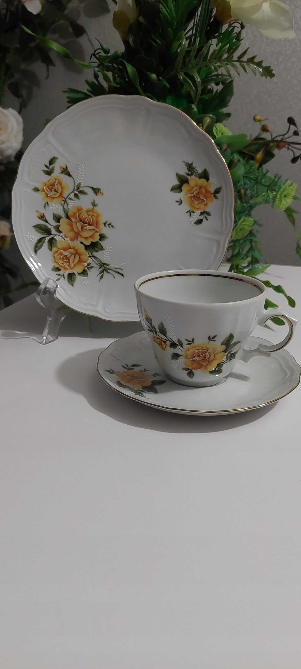 Трио в очень хорошем состоянии, размеры: высота чашки 7см, диаметр наполнителя 9см, диаметр тарелки для чашки 14см, диаметр десертной тарелки 19см.