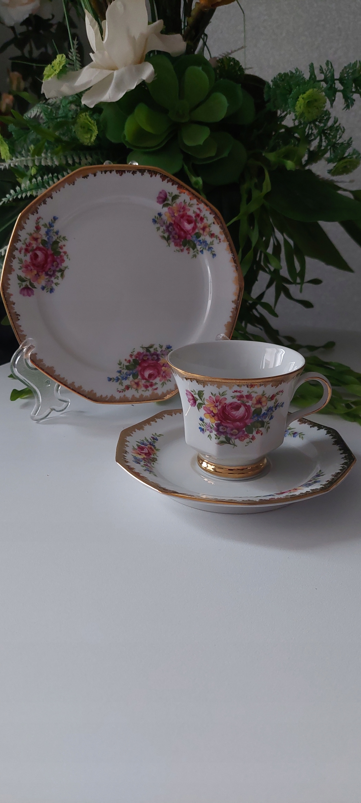 - Трио с размерами: высота чашки 6см, диаметр наполнителя 8см, диаметр тарелки для чашки 14см, диаметр десертной тарелки 17см.
