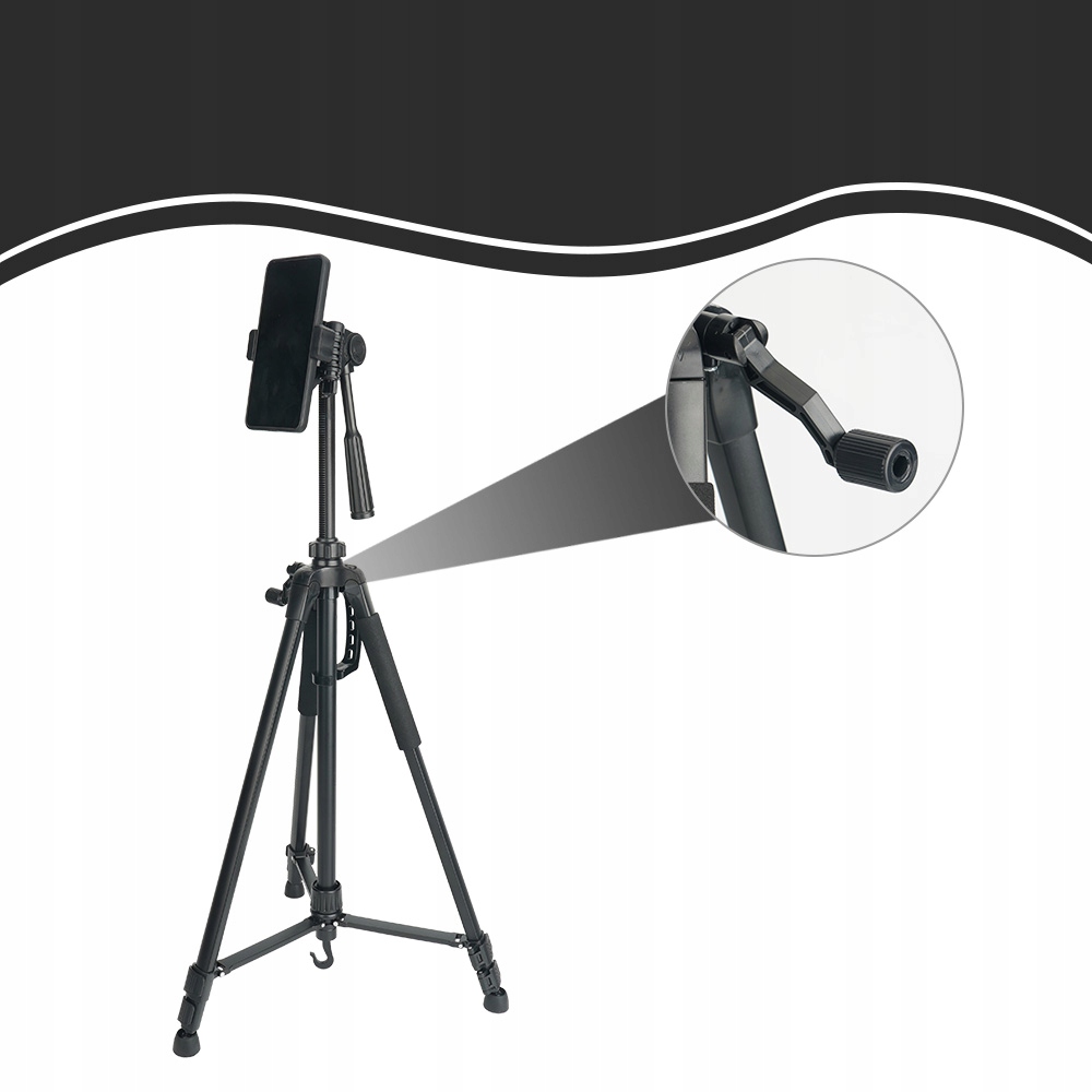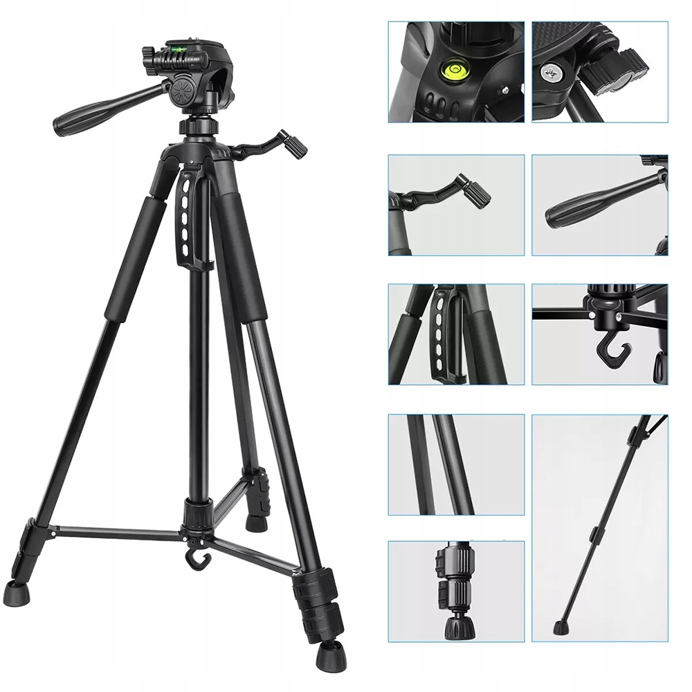 Изготовлен из высококачественного алюминиевого сплава и экологического материала ABS. Штатив является наиболее устойчивой конструкцией благодаря 3-секционным ножкам. Внизу центральной колонны есть крючок, на который рекомендуется повесить что-нибудь, чтобы сохранять равновесие.