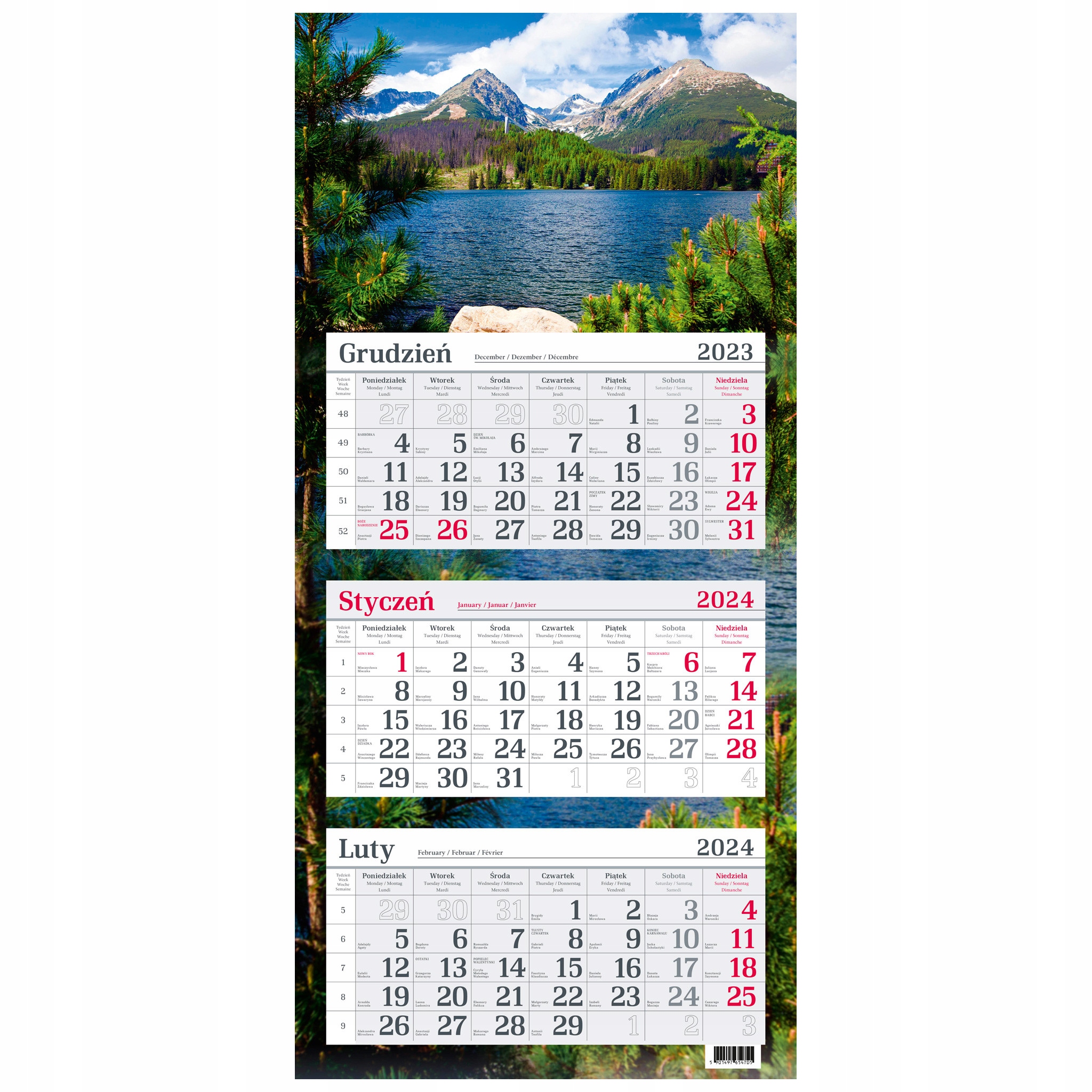 Календарь из трех частей, напечатанный на белой бумаге. Содержит нумерацию недель, польские названия, воскресенья и праздники, выделенные красным. Польша, Великобритания, Германия, Франция.