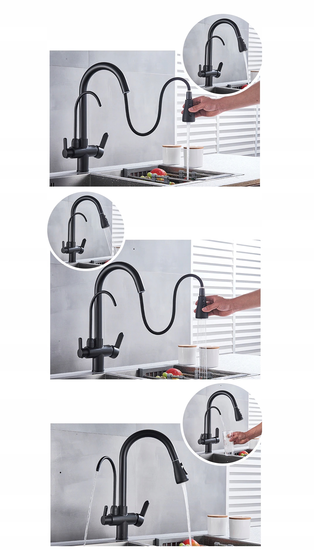 Если у вас раковина с двумя чашами или вы часто используете воду на кухне за пределами зоны мойки, хорошим решением станет кухонный смеситель с выдвижным изливом. Он позволяет направить струю воды в любую сторону, мыть большую посуду или наполнять кастрюлю на столешнице.
