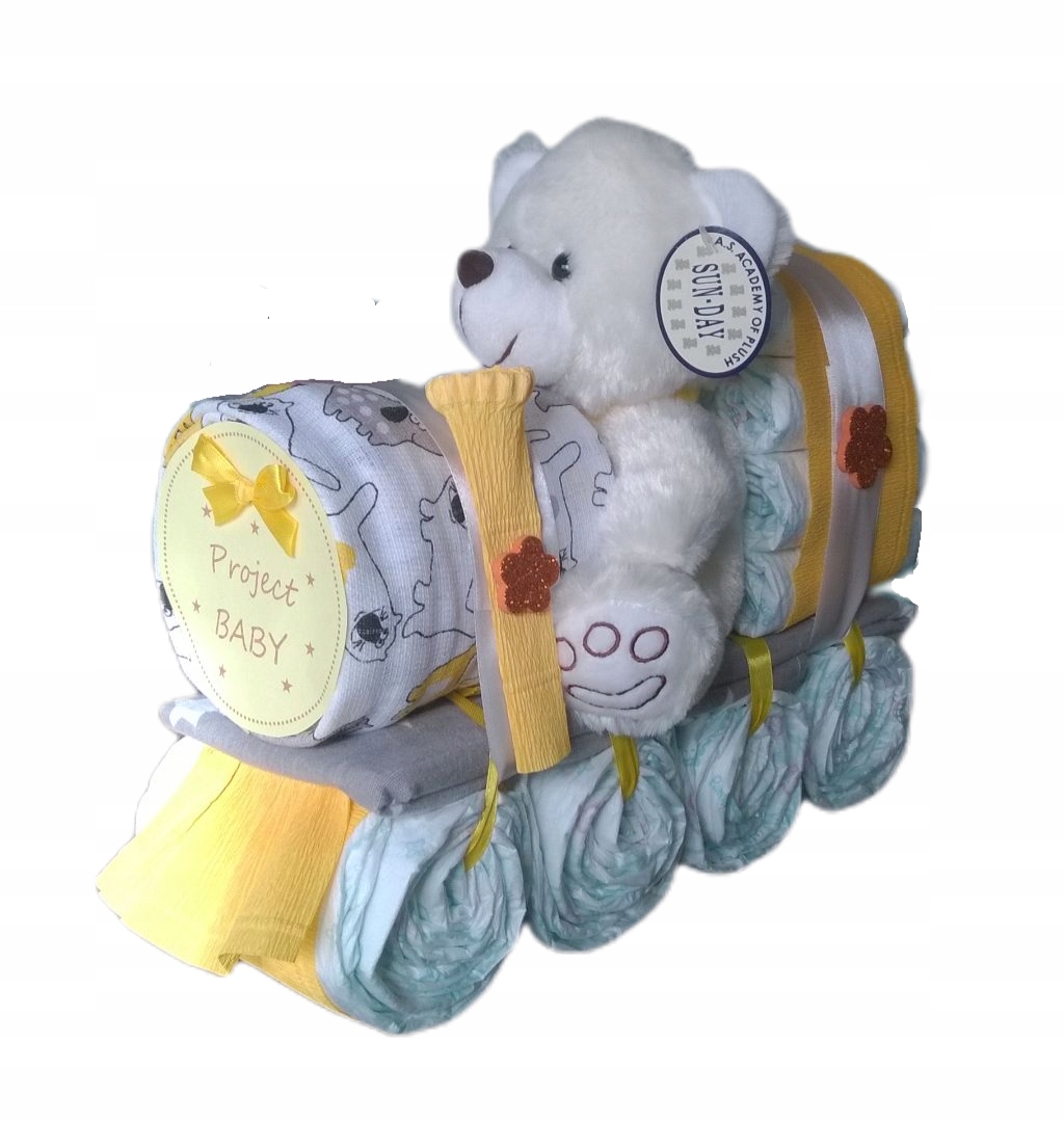 На этом аукционе мы предлагаем торт из подгузников - ЛОКОМОТИВ. В комплект входит мягкий плюшевый мишка, красочная ткань и фланелевый подгузник.