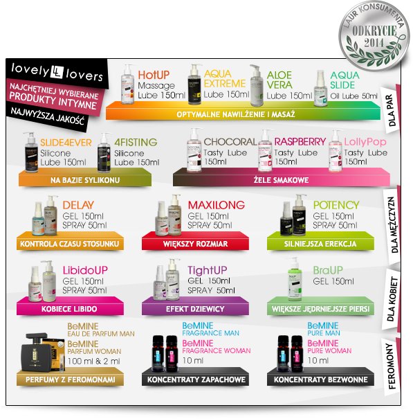 Бренд Lovely Lovers является результатом работы специалистов со всей Европы. Технологи стараются создавать уникальные и эффективные формулы по доступной цене. Благодаря этому была создана интимная косметическая линия для требования получателей, которые ценят наибольшее качество интимной жизни. Все продукты протестированы дерматологически, производится в соответствии со стандартами фармацевтической GMP (Good Manufacturing Practice) и зарегистрированных в KSIOK (Национальная система информации о косметике) / CPNP (портал уведомлений о косметических продуктах). Самые высокие стандарты контроля над качеством и происхождением сырья дают потребителям уверенность в продукте и эффективности высочайшего качества, подтвержденным тестами и мнениями удовлетворенных клиентов. Это подтверждается премией Boliday Lovers Brand за то, что он занял 1 место в категории «Интимные приготовления» в категории «Интимные приготовления».