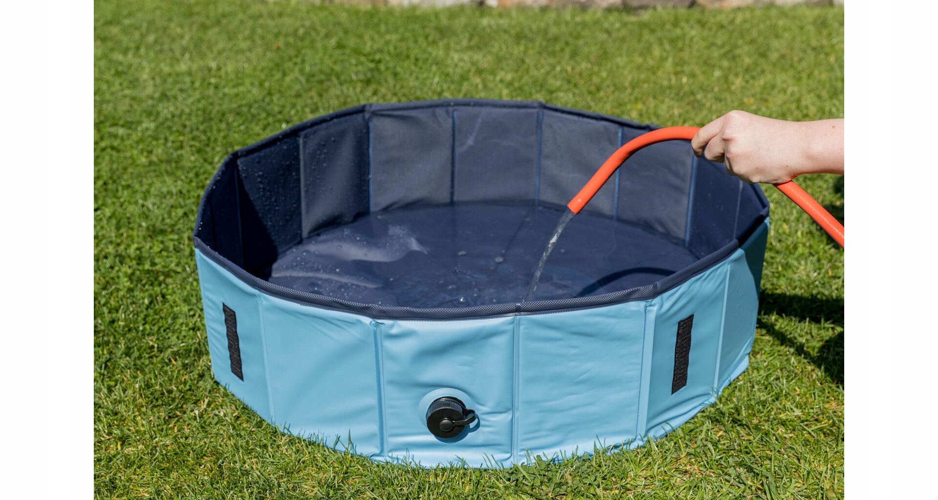 Изделие имеет нескользящее основание внутри бассейна, что позволит вашему питомцу чувствовать себя стабильны и готовы использовать новую достопримечательность. В бассейне есть клапан на одной из стенок, благодаря которому можно легко вылить воду. В сложенном виде бассейн занимает мало места – его легко транспортировать при выезде за город и не составит труда хранить осенью и зимой.