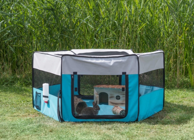 манеж из полиэстера для щенков и котятам он идеально подходит для использования как в помещении, так и на улице. Водонепроницаемое съемное дно манежа защищает пол в квартире от царапин, грязи и влаги (например, мочи). Манеж можно использовать и без водонепроницаемого пола, например, на траве, чтобы животные имели с ним непосредственный контакт, это особенно удобно в случае с кроликами.