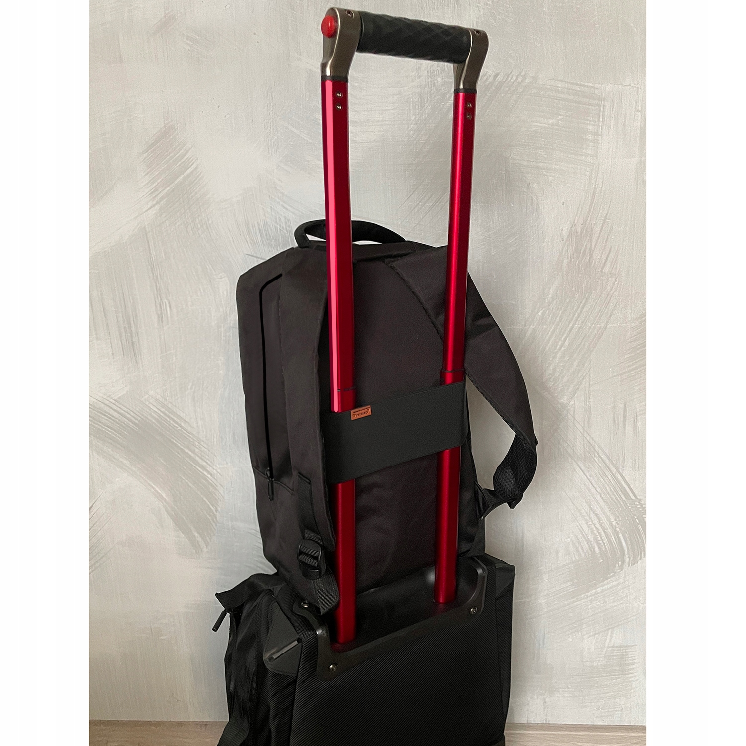 Это практическое решение, которое позволяет применить рюкзак на ручку чемодана. Это прочно облегчает транспорт багажа.