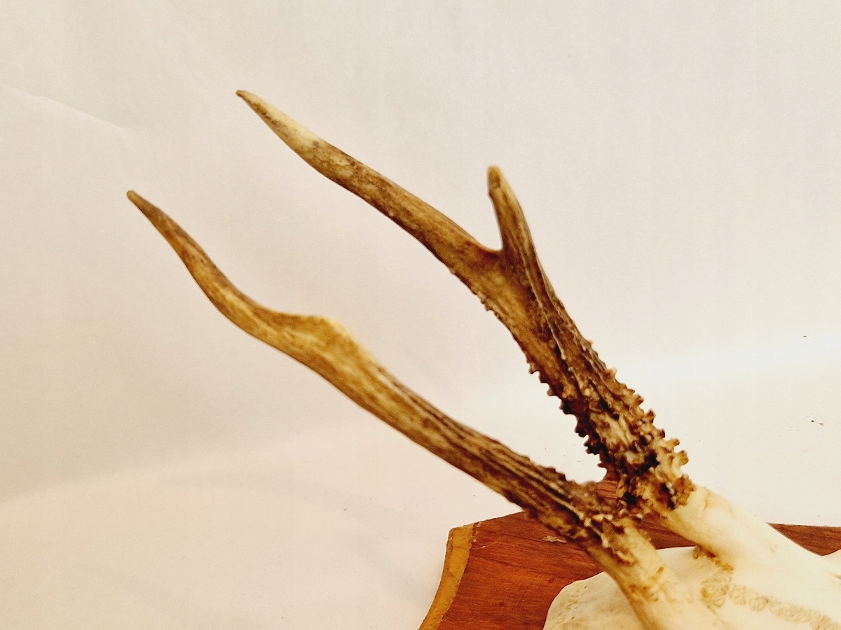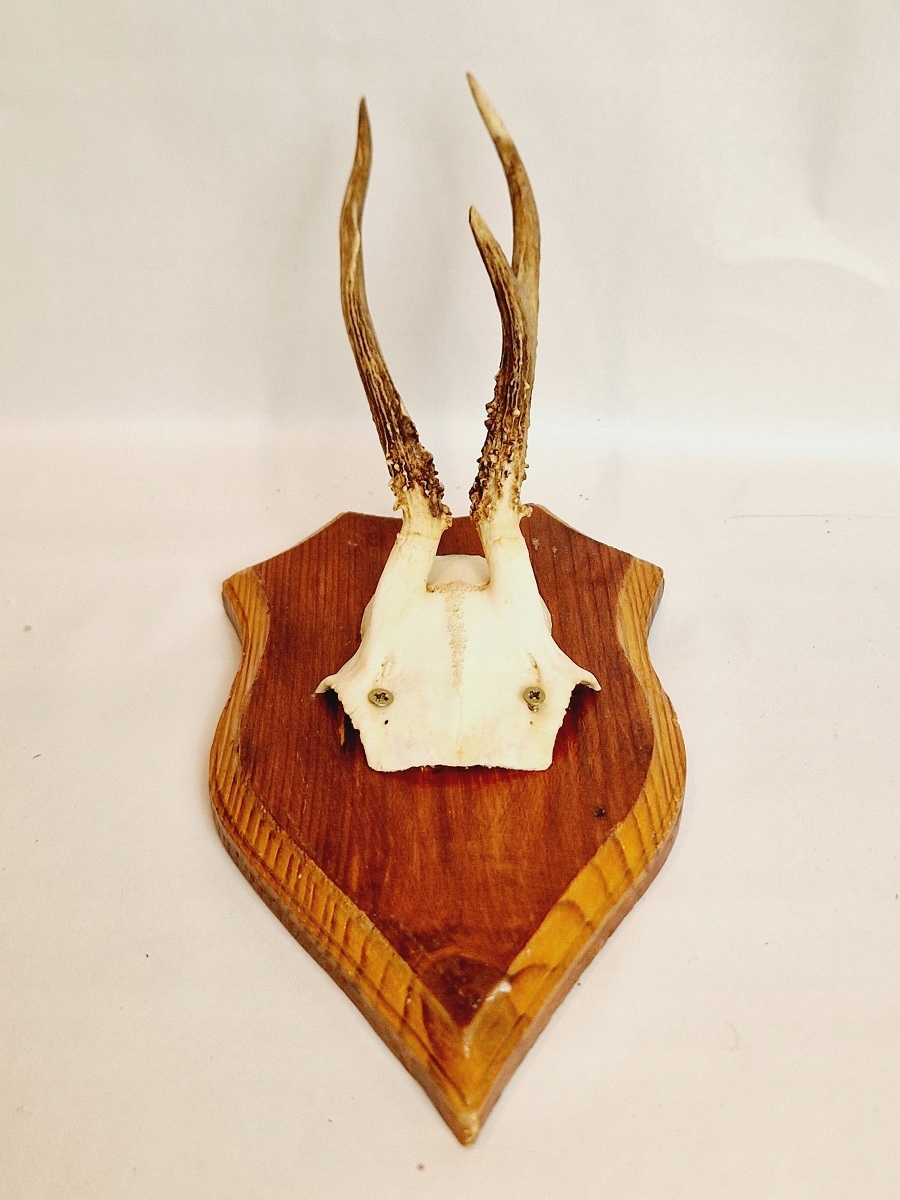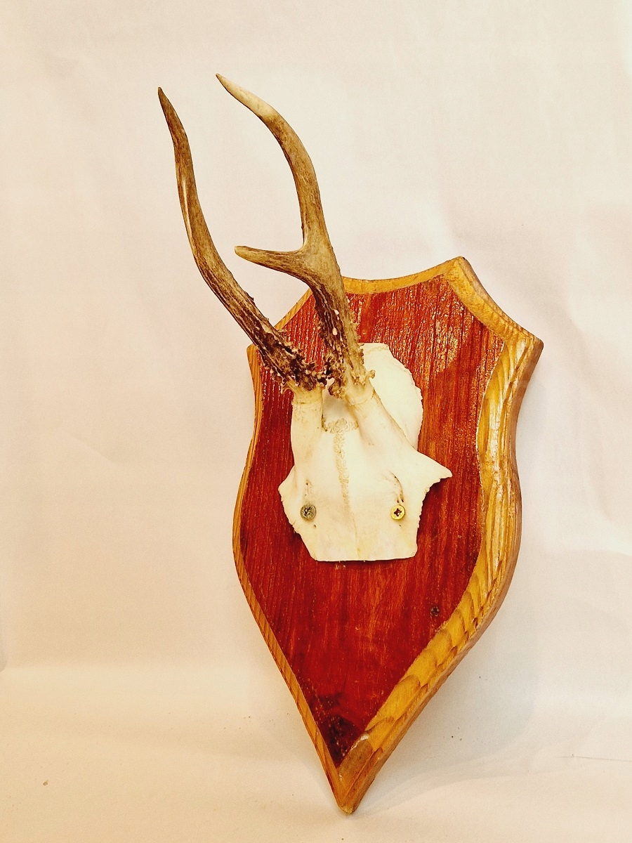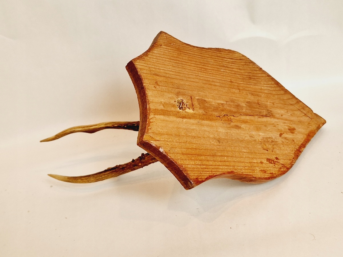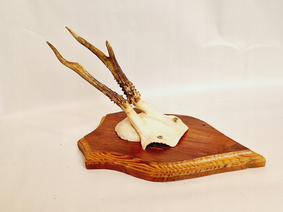Трофум на доске - скамейки рога оленя милкуса с фрагментом черепа /661