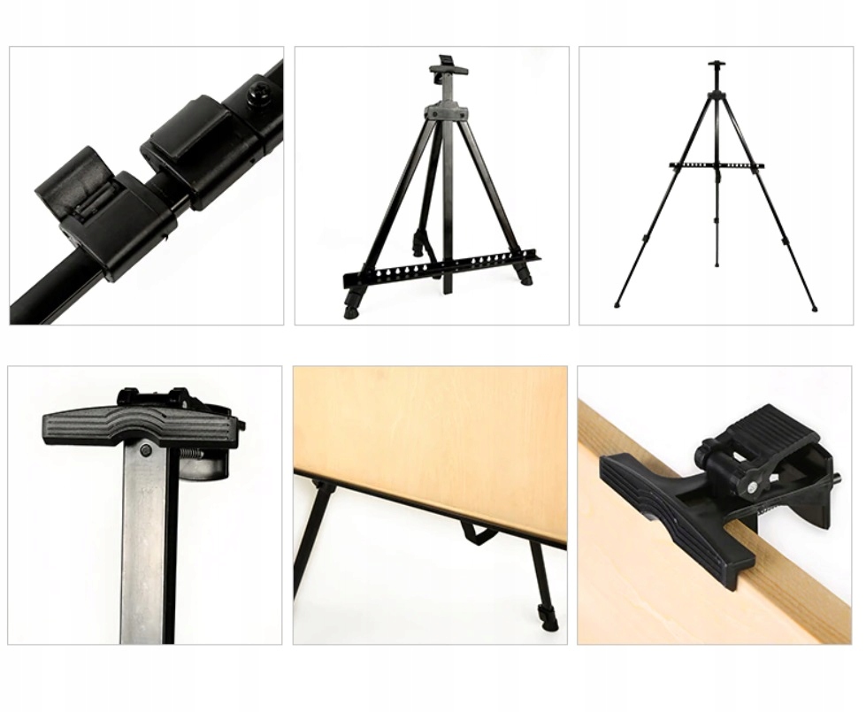 Картину легко монтировать с помощью пружинный зажим наверху конструкции и горизонтальная балка, поддерживающая картины. Регулировка мольберта очень проста благодаря зажимам на ножках, ручке, регулирующей высоту картины, и зажиму, удерживающему картину сверху.
