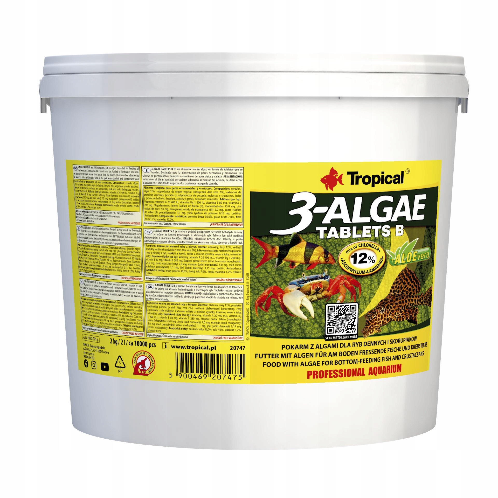 Предназначен для ежедневного кормления пресноводных и морских травоядных рыб, для которых водоросли являются важным компонентом рациона, а для всеядных рыб - в качестве прикорма. Таблетки 3-Algae Tablet B содержат три водоросли: хлореллу (Chlorella vulgaris), Ascophyllum nodosum и Laminaria digitata, известную как ламинария. Ненасыщенные жирные кислоты, белок (богатый экзогенными аминокислотами) и витамины, содержащиеся в хлорелле, а также микро- и макроэлементы из ламинарии (в том числе йод, хром, селен и железо) обеспечивают отличное состояние, интенсивный рост и жизнеспособность рыб. Рыбы, которых регулярно кормят 3-Algae Tablets B, получают большую дозу хлорофилла – зеленого красителя, концентрированным источником которого является хлорелла. Хлорофилл ограничивает рост нежелательных бактерий в пищеварительном тракте, предотвращая воспаление, а вместе с цеолитом способствует выведению токсинов из организма рыб. Экстракт алоэ поддерживает иммунную систему рыб и способствует развитию правильной бактериальной флоры в пищеварительном тракте. Благодаря своим укрепляющим свойствам этот корм рекомендуется для кормления рыб во время карантина, акклиматизации и выздоровления.