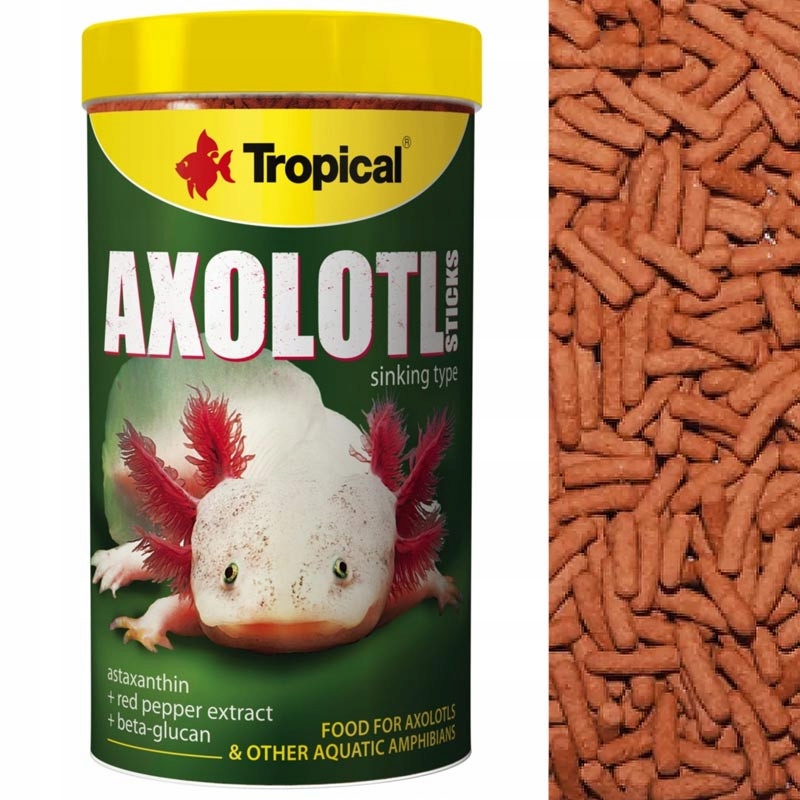 Палочки Axolotl — это корм для аксолотлей и других водных амфибий. Специальный высокобелковый корм в виде тонущих палочек для мексиканских аксолотлей, тритонов вальтла, шпорцевых лягушек и других водных земноводных, рацион которых состоит из животных организмов. Обилие ингредиентов животного происхождения, в том числе рыбы, моллюсков и ракообразных, является источником высококачественного, легкоусвояемого белка. Правильно сбалансированный состав витаминов и микроэлементов гарантирует, что регулярное кормление амфибий Аксолотлем Палками обеспечивает их правильный рост и развитие, а добавление астаксантина и экстракта перца усиливает окраску животных. Обогащение корма природным иммуностимулятором - бета-глюканом укрепляет иммунную систему земноводных, поддерживая регенеративные процессы, происходящие после возможных укусов аквариумных обитателей.