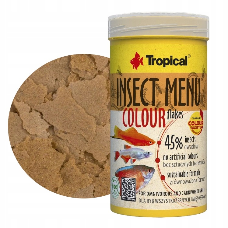 Хлопья Tropical Insect Menu — усиливающий окраску корм на основе насекомых. Предназначен для всеядных и плотоядных аквариумных рыб. Имеет форму лепестков. Содержит герметию, тутового шелкопряда и мучного червя. Усиливает рост и регулирует пищеварение.