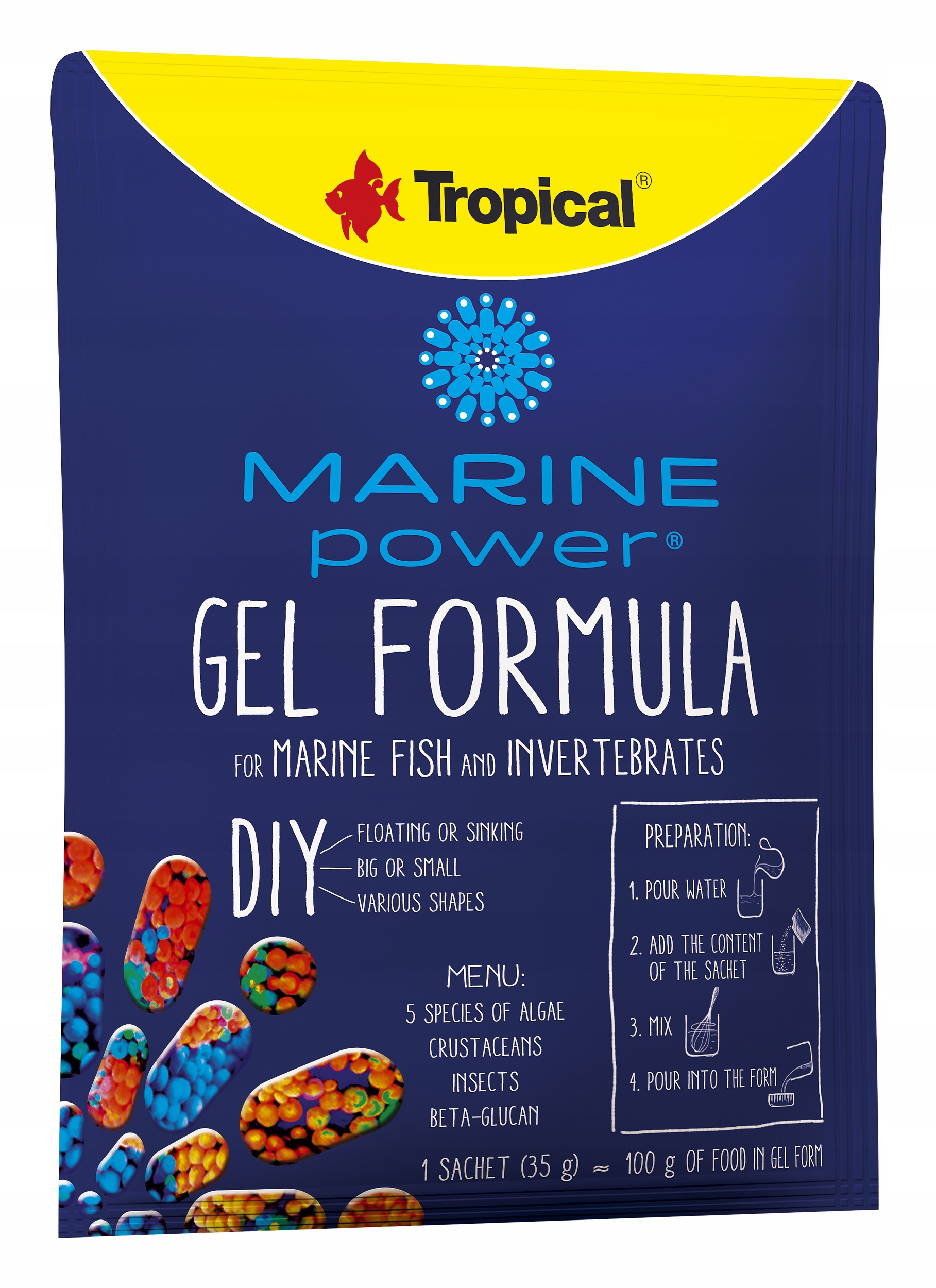 Гель Marine Power Gel Formula — это пища, которую можно приготовить разными способами. Он посвящен всеядным рыбам и морским беспозвоночным, таким как креветки, крабы, омары и омары. Еда имеет форму желе, которое легко и быстро приготовить самостоятельно, поэтому можно выбрать практически любую форму и размер порции, и даже способ подачи и то, будет ли готовая еда плавать или тонуть – в соответствии с пищевой потребности животных. Благодаря возможности хранения в морозильной камере является прекрасной альтернативой замороженным продуктам.