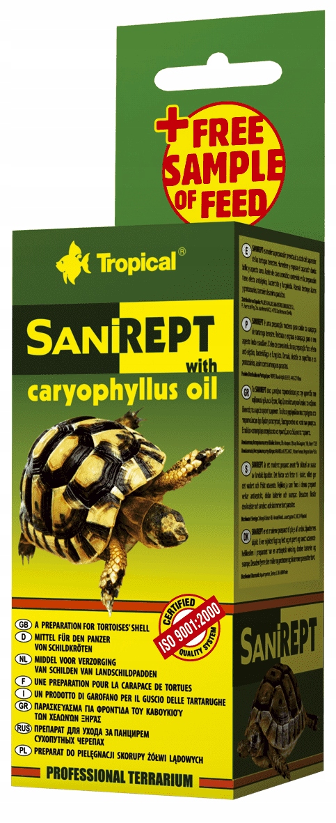 SANIREPT препарат с гвоздичным маслом для ухода за панцирем черепах. Панцирь черепахи – зеркало ее состояния. Неправильное питание, дефицит витаминов и минералов, а также проблемы с почками приводят к необратимым деформациям брони. Таким образом, уход за панцирем черепахи включает в себя множество факторов. Животным должны быть обеспечены соответствующие условия содержания (просторный и чистый террариум, соответствующая влажность, температура и освещение), а также разнообразный и сбалансированный рацион, богатый кальцием и витамином D3. Скорлупу следует содержать в чистоте. После каждого купания черепах рекомендуем смазывать их панцири средством САНИРЕПТ с экстрактом гвоздики. Скорлупа приобретет красивый блеск и здоровый вид. Содержащееся в препарате гвоздичное масло оказывает антисептическое действие, отпугивает паразитов и ограничивает развитие клещей и простейших.