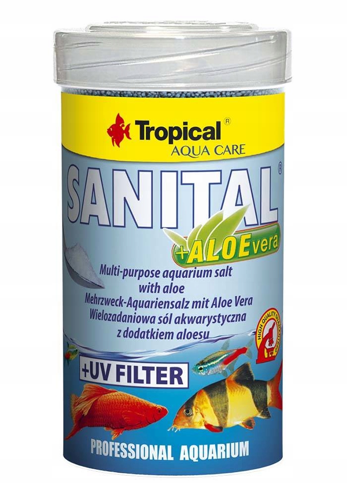 <ул>Санитал – аквариумная соль с добавлением алоэ, предназначенная для приготовления ванн в периоды ухудшения состояния рыб, например, после транспортировки, в период акклиматизации, при обнаружении дефектов кожи на поверхности тела рыб и т.п., после значительной подмены воды в аквариуме и как вспомогательное средство при борьбе с оспой рыб (можно применять совместно с препаратами Ихтио и ЦМФ).