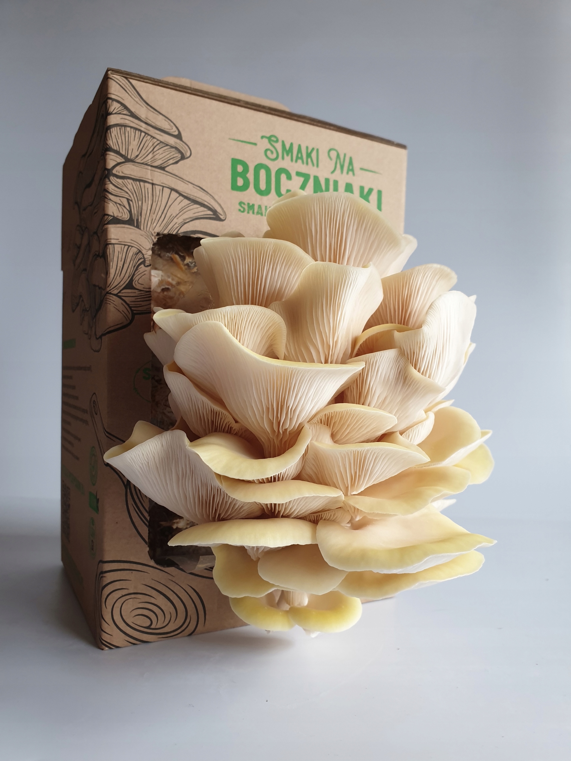 Набор для выращивания вешенок своими руками в домашних условиях от Smaki na Oyczniaki включает в себя мицелий, упаковку и опрыскиватель.