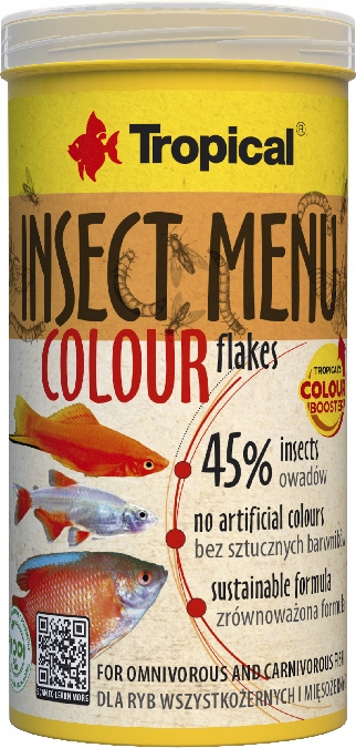Естественная красота твоей рыбы у твоих пальцев! Цветные хлопья с меню насекомых - это современная цветная пища в форме лепестков, созданная для всеядных и плотоядных декоративных рыб. Он содержит до 45% высококачественного белка насекомых и инновационной формулы Color Booster Tropical, которая усиливает цвета и поддерживает здоровье ваших учеников.