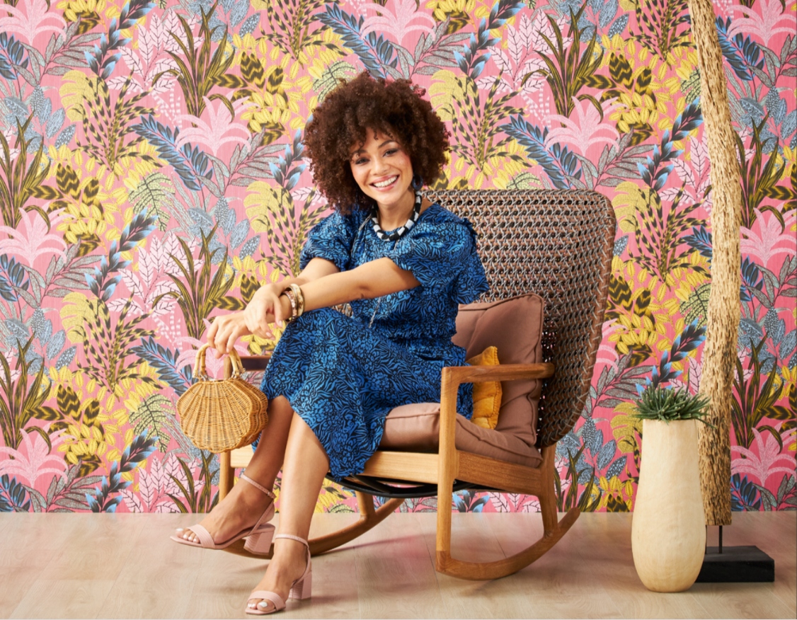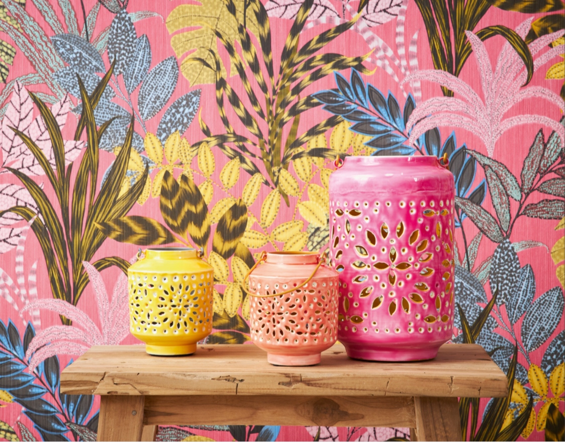 Современные обои, изображающие красочные пальмовые листья на розовом фоне, оказывая трехмерный эффект на стену