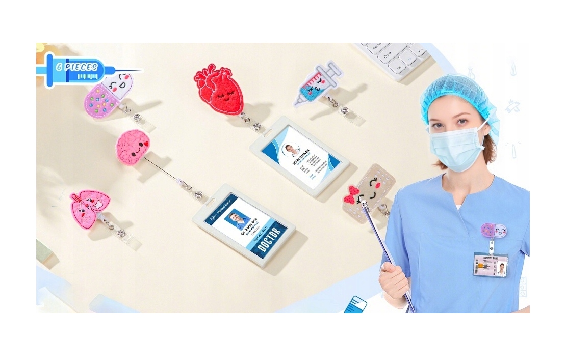 Прочный материал:Каждая катушка (таблетка, бинт, шприц, сердце, мозг, легкое) изготовлена из прочного войлока, прочно прикрепленного к основанию катушки. Конструкция прочная и долговечная, а выдвижной держатель бейджа хорошо фиксируется, что позволяет постоянно использовать его на униформе, блузке или сумке.