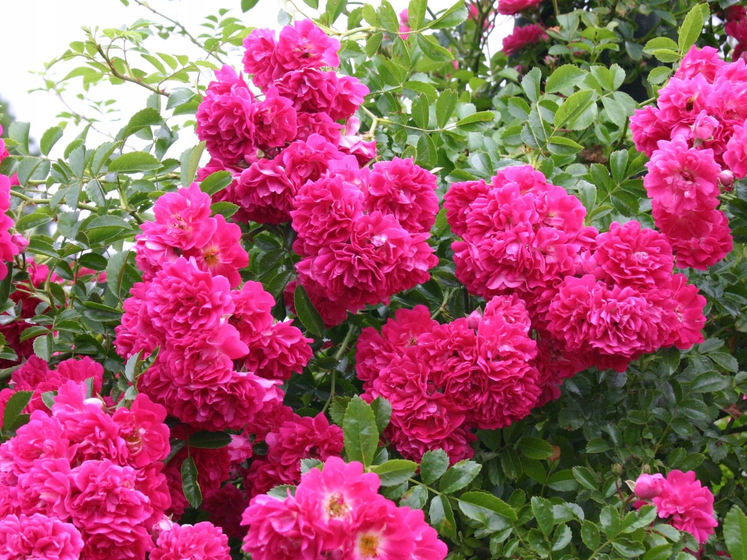 Цветки малиново-розовые, мелкие, около 3 см в диаметре, розетковидные, очень пышные, в крупных, многоцветковых соцветиях. Они плохо пахнут. Цветение очень обильное и позднее – чаще всего начинается на рубеже июня и июля и продолжается около месяца. Куст не повторяет цветение и не плодоносит. Соцветия формируются на коротких побегах вдоль прошлогодних приростов. Однолетние побеги не цветут. Листья мелкие, состоят из мелких, свежезеленых, блестящих листочков. Побеги облиственные, очень длинные однолетники, высотой до 3-5 метров, тонкие и гибкие, легко укладываются и формируются на опорах. Растения быстро растут и летом образуют множество побегов, часть из которых необходимо удалять, а остальные регулярно подвязывать к опорам.