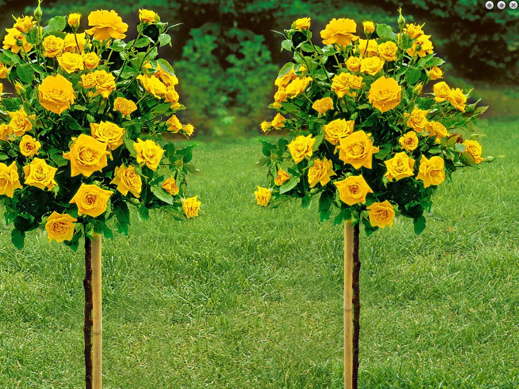 - Шамбовую розу из-за внешнего вида часто называют розовым деревом. Это очень хороший сорт с красивыми, пышными, очень большими (около 13 см в диаметре) цветками желтого цвета и нежным ароматом. Этот сорт зацветает с июня и повторяет свое цветение. Идеально подходит как украшение сада, а также как срезанный цветок для бутылки.