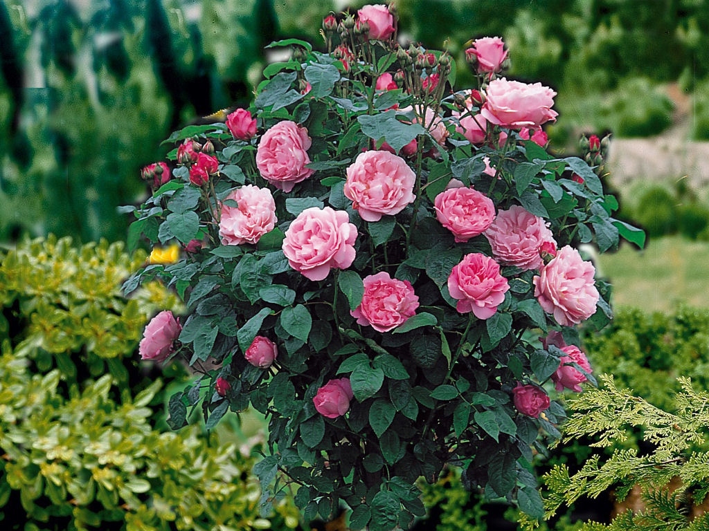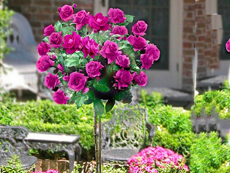 - Шамбовую розу из-за внешнего вида часто называют розовым деревом. Это очень хороший сорт с красивыми, пышными, крупными (около 11 см в диаметре) цветками розового цвета и интенсивным ароматом. Этот сорт зацветает с июня и повторяет свое цветение. Идеально подходит в качестве декора.
