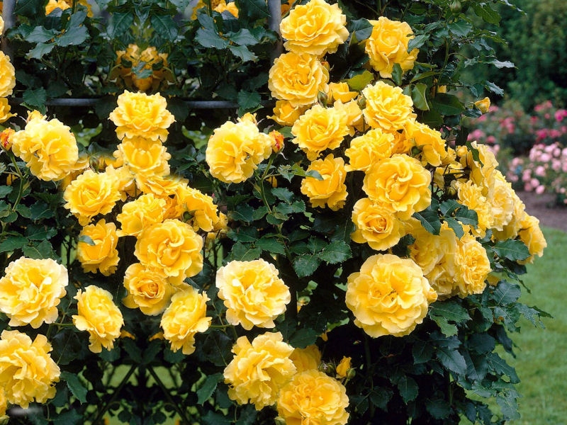 - Ценный, простой в выращивании сорт, с длительным и обильным цветением. Довольно устойчив к морозам. Цветки после раскрытия темно-желтые, благородной формы, мало увядающие, многочисленные, около 8-10 см в диаметре. На побегах очень пышные, собраны в несколько соцветий. Интенсивный аромат. Высота ок. 1,5-2 м, ширина 1,5 м.