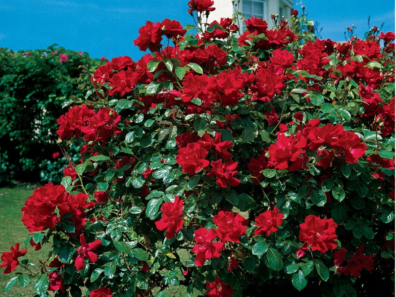 - Цветет на побеге, обычно метелками из нескольких цветков. Цвет темно-красный с бархатистым блеском. Они пахнут корзинкой малины на солнце и, что немаловажно, не выгорают. Цветут обильно с середины июня по октябрь. Листья темные и кожистые. Очень устойчив к болезням, но требует тщательной защиты зимой. В наших условиях он вырастает до 2,5 метров, но чтобы куст не развалился, ему необходимы небольшие опоры и регулярное подвязывание. Молодые побеги красно-коричневого цвета. Побеги жесткие, крепкие, колючие. Если не убирать отцветшие цветки, легко появляются крупные оранжевые плоды.